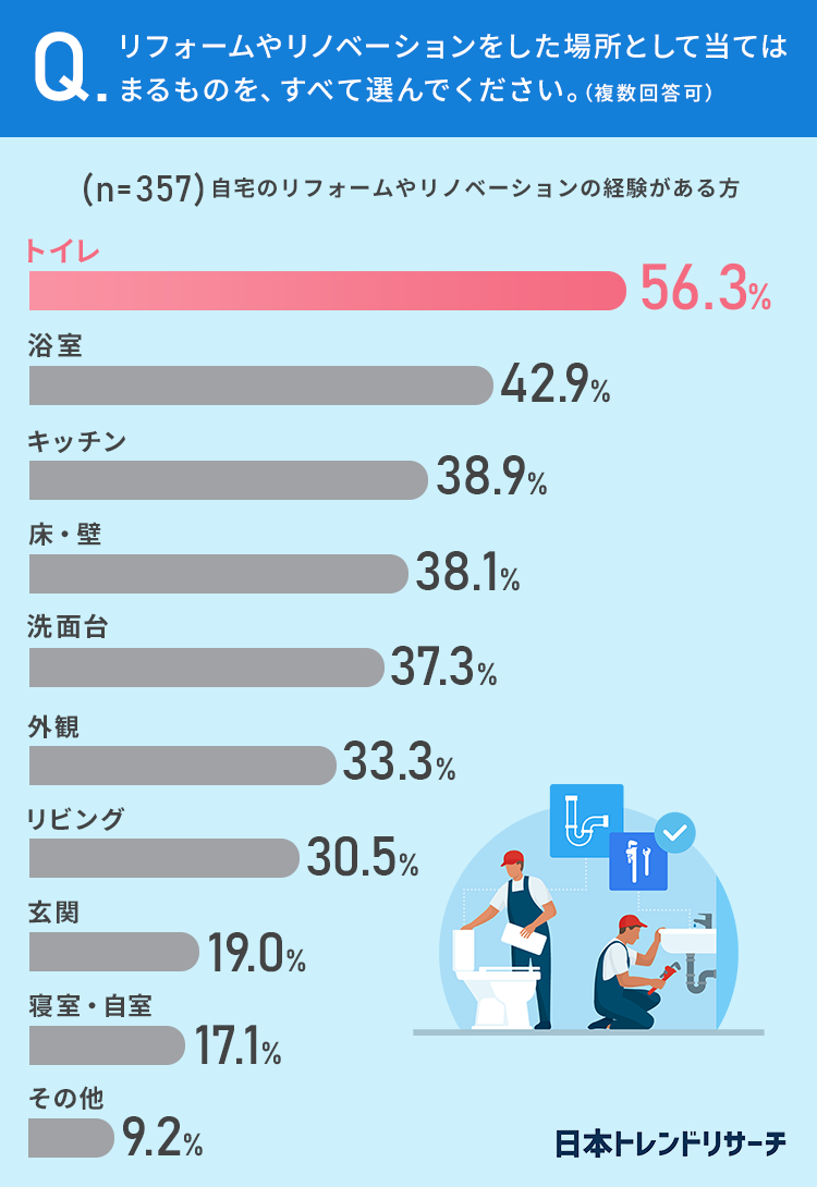 トイレ、浴室、キッチン、床・壁といった順でリフォームやリノベーションをしている方が多いようです。