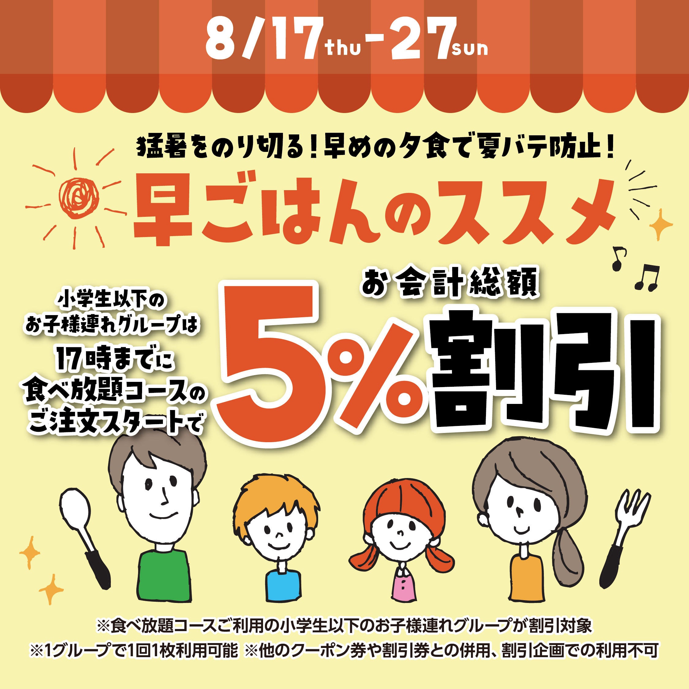 ◆内容:小学生以下のお子様連れのご家族対象で17時までに食べ放題コースご注文スタートでお会計総額から5%割引