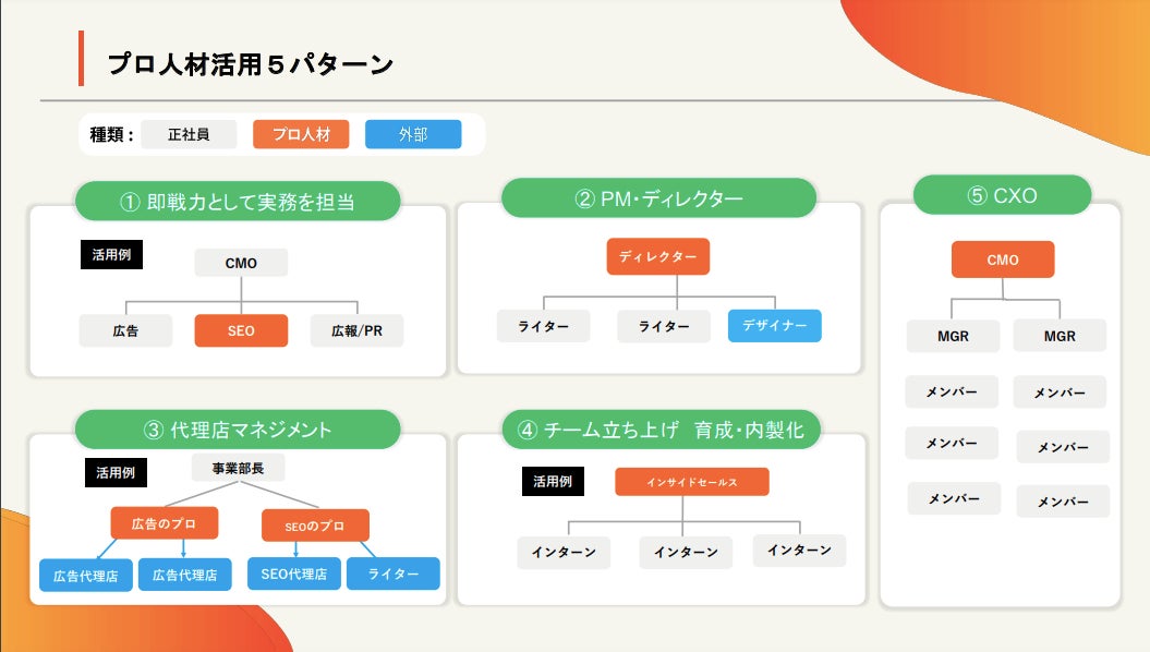 特にマーケティング領域を強みとしており、広告運用、SNS、SEO、オウンドメディア 、動画、広報・PRなど施策が多様化、高度化する中で、スキルと実績の豊富なマーケティングプロ人材を戦略から実務まで必要なボリュームでアサインすることができます。