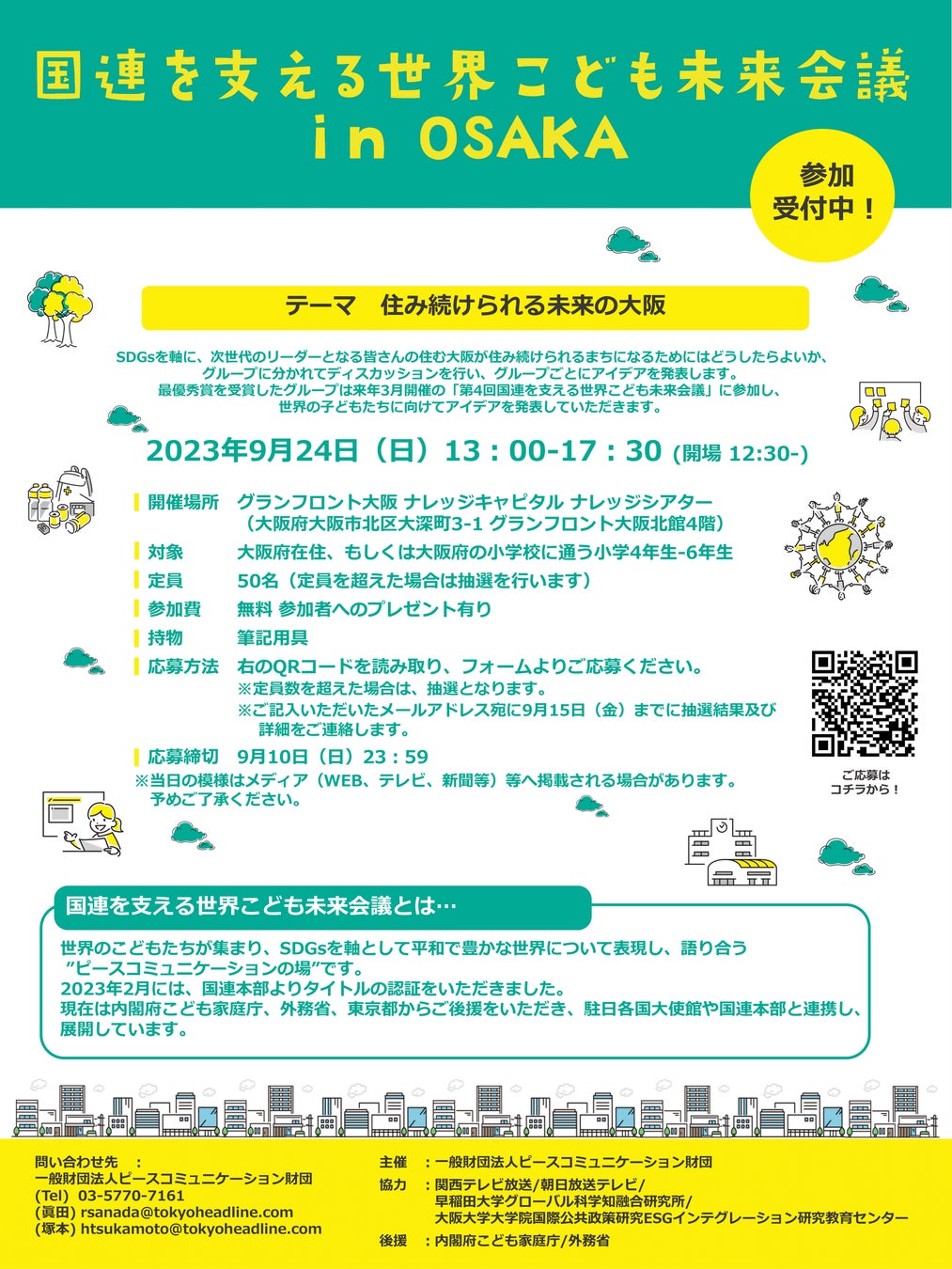 一般財団法人ピースコミュニケーション財団は9月24日、「国連を支える世界こども未来会議 in OSAKA」をグランフロント大阪 ナレッジキャピタル ナレッジシアターにて開催します。