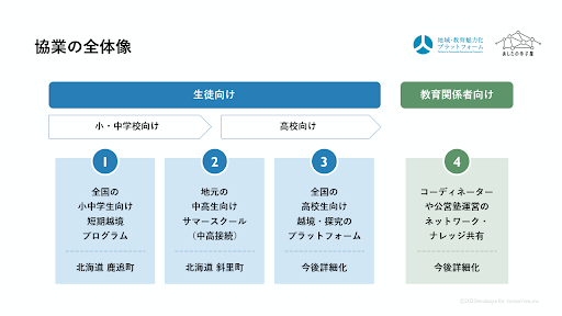 上記の背景のもとで、「世界を拡げる一歩目をどこからでも」というビジョンを掲げるあしたの寺子屋と「意志ある若者にあふれる持続可能な地域・社会をつくる」というビジョンを掲げる地域・教育魅力化プラットフォームは、中高生たちの越境教育エコシステム創出に向けた包括的なパートナーシップを締結する運びになりました。
