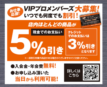 ビバホームのVIPプロメンバース証は資材・工具関連商品を対象※に現金のお支払い時には5%、クレジットカードのお支払い時には3%を割引するプロフェッショナルを応援する会員カードです。