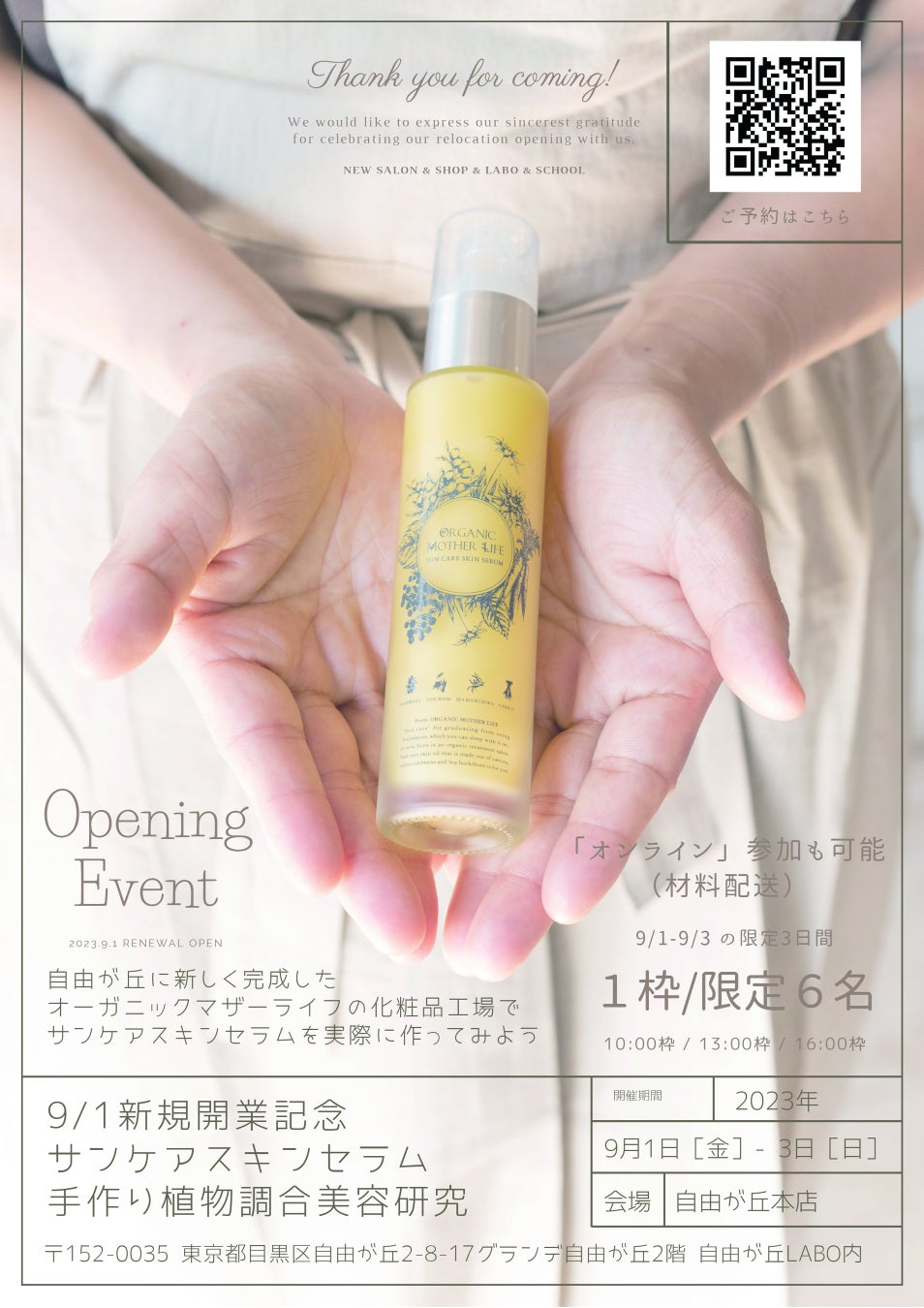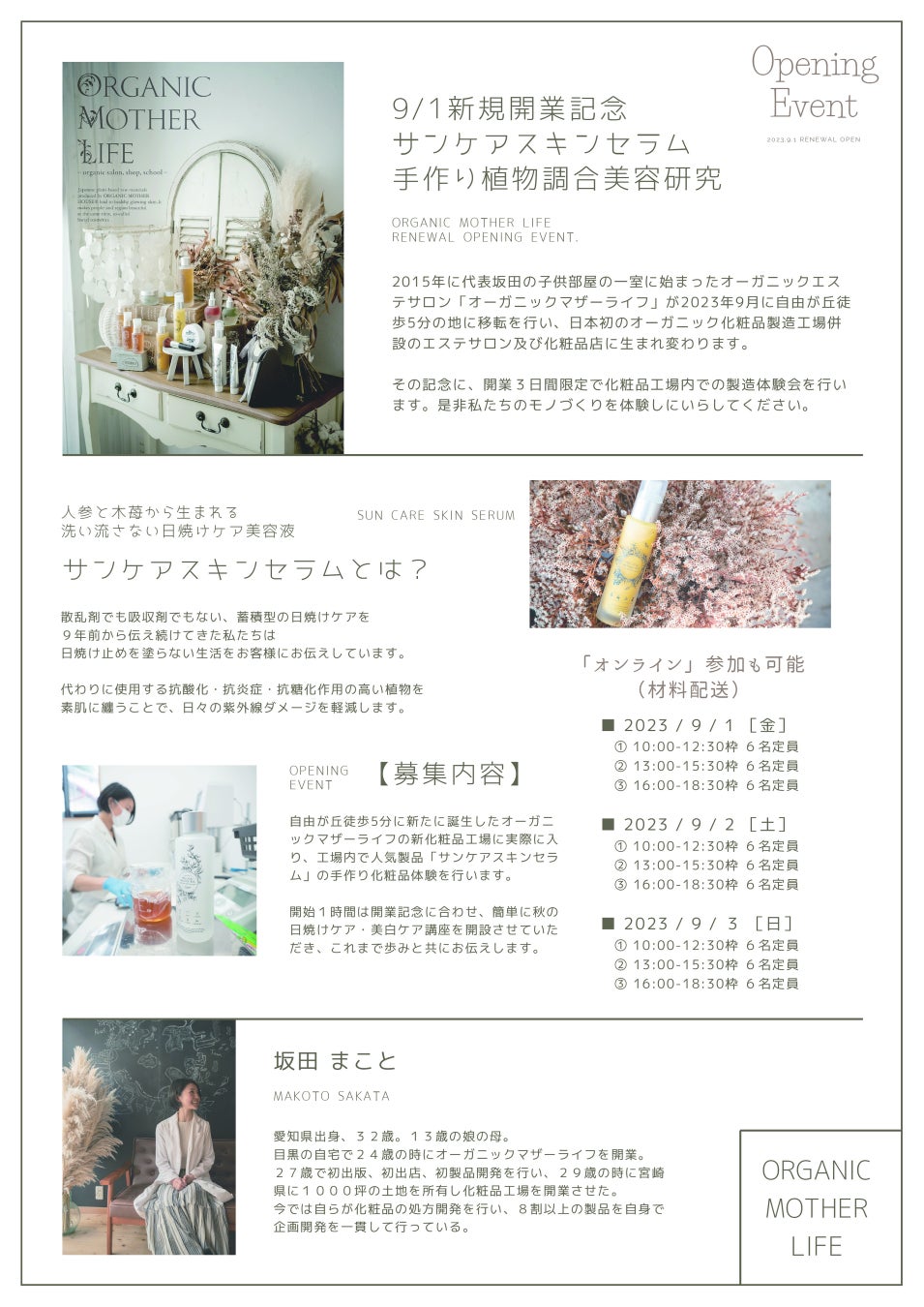 新たに誕生したオーガニックマザーライフの新化粧品工場に実際に入り、工場内で人気製品「サンケアスキンセラム」の手作り化粧品体験を行います。開始1時間は開業記念に合わせ、簡単に秋の日焼けケア・美白ケア講座を開設させていただき、これまで歩みと共にお伝えします。