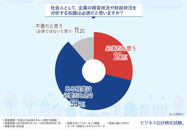 「社会人として、企業の経営状況や財政状況を分析する知識は必須だと思いますか?」と質問したところ、『必須だと思う(29.1%)』『ある程度は必要だと思う(59.7%)』とおよそ9割の方が、経営や会計の知識は社会人に必要だと回答しました。