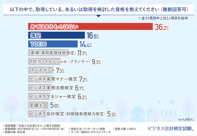「以下の中で、取得している、あるいは取得を検討した資格を教えてください(複数回答可)」と質問したところ、『簿記(16.5%)』と回答した方が最も多く、次いで『TOEIC(14.4%)』『英検(実用英語技能検定)(11.7%)』『FP(ファイナンシャル・プランナー)(9.3%)』『ITパスポート(7.3%)』『ビジネス実務マナー検定(7.2%)』『ビジネス実務法務検定(6.7%)』『ビジネスマネジャー検定(6.2%)』『宅建士(5.8%)』『ビジネス会計検定(財務諸表理解力検定)(5.3%)』と続きました。