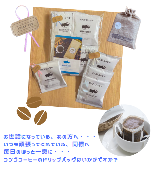 特定非営利活動法人聖母(NPO法人せいぼ)は、2018年からマラウイ産コーヒーを使用した日本での活動を展開しています。主な商品として、現地スタッフと協働して給食支援をしているマラウイで収穫されたコーヒー100gmの粉と豆、及び10gmのドリップバックを販売しています。