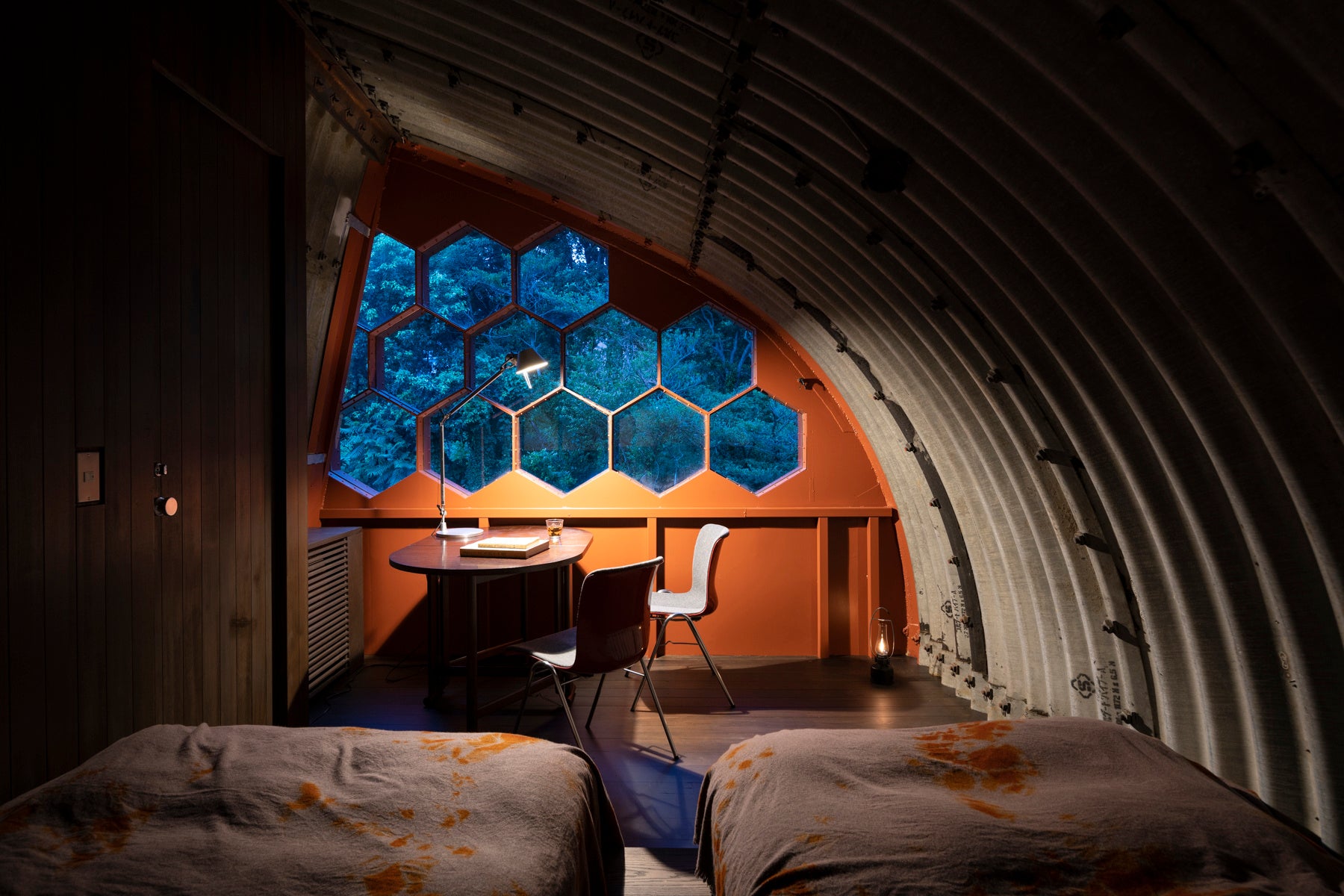 コルゲートハウスとは、トンネルや地下鉄などに使われるコルゲートパイプを使った建築です。建築家である川合健二氏が、インフラから脱却し、自然の中で自給自足の生活を送りたいという想いで、自邸として建てました。日常から切り離された生活を味わえる究極の空間としてDOCOMOMO(モダン・ムーブメントにかかわる建物と環境形成の記録調査および保存のための国際組織)に選出されて話題となった個人住宅としてセルフビルドされた建物です。