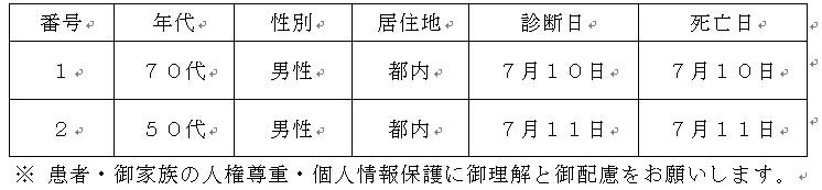 新型コロナウイルスに関連した患者の死亡について business Twitter Facebook はてブ Pocket LINE コピー 2022.07.16 この記事は約1分で読めます。 都内で新型コロナウイルスに感染した方が死亡されましたのでお知らせします。 お亡くなりになった方のご冥福をお祈り申し上げます。