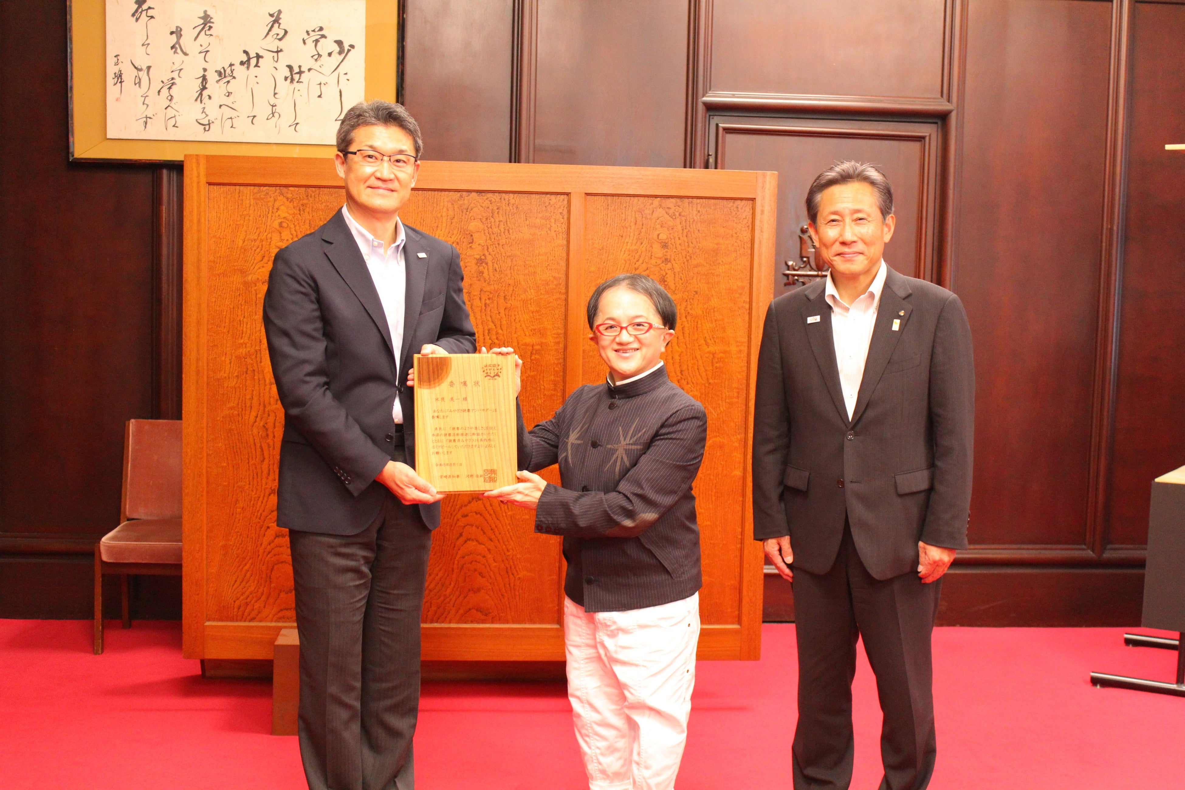 8月1日に行われた交付式で、河野知事は、「アンバサダー第1号になっていただきました。素晴らしい方にアンバサダーに就任していただいて感激しています。読書フェスタなどでの活躍を期待しています。」と述べました。