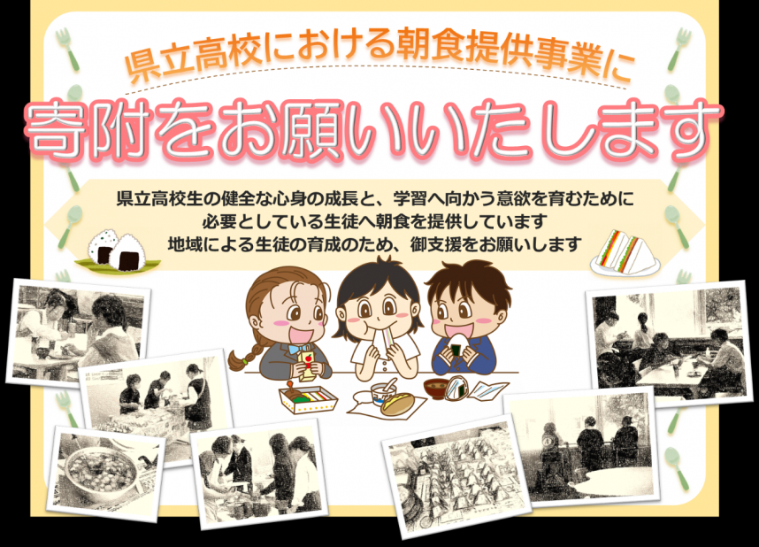 現在、神奈川県教育委員会では県立高校4校(県立田奈高校、県立大和東高校、県立相模向陽館高校、県立津久井高校)において、週に2回程度、在校生の希望者に対し、NPO法人等の協力のもと朝食を提供する事業に取り組んでいます。