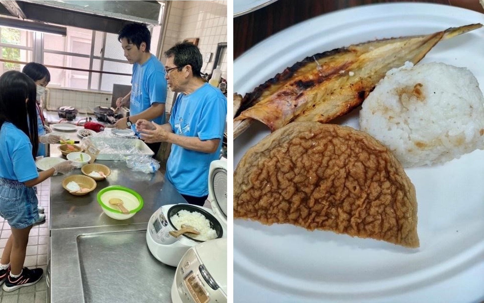 結城豊廣さんに島野浦の海の恵みについてお話しいただき、九州でナンバーワンと言われている日向灘の海水で作る塩で海の恵みたっぷりのおにぎりを自分たちで握りました。おにぎりの具材は、島野浦で獲れるタイで作った「鯛ほぐれ」。ふわふわとした弾力と口触り、絶妙なほぐれ感が魅力の一品です。マダイ一匹から6個分しか作れず、醤油と塩は地元で丁寧に作られた物を使用した、シンプルだけど濃厚な味わいです。子供たちにも大人気で、おにぎりの中と表面にまぶして贅沢に使っていました。その他にも島野浦の鰹節や、シンプルに塩むすびなどを一人3個ほど作って実食し、「おいしい!鯛ほぐれでおにぎり何個でも食べられる!このタイが島野浦で育っているんだ。すごい!」と言いながら食べていました。また、島野浦で獲れたカマスの干物や、島野浦の郷土料理「あげみ」もいただき、島野浦の海の恵みを存分に堪能しました。