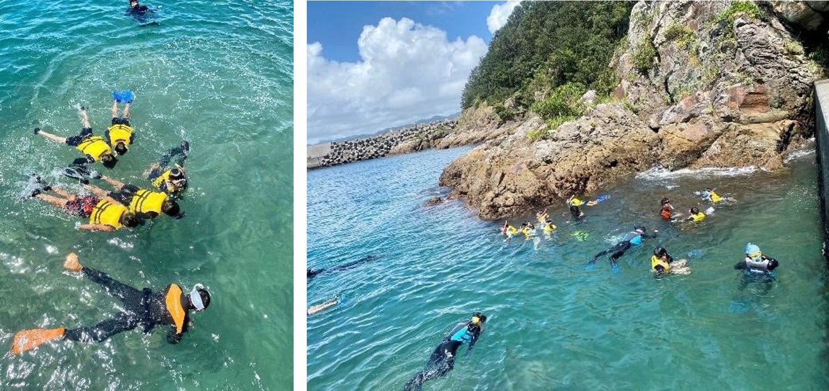 2日目も台風の影響はありましたが、安全なポイントに潜る場所を変え、海の中を見ることから始まりました。シュノーケリングは初めての参加者が多く、5人1組になり、それぞれインストラクターの方から海を安全に楽しむ方法を教えてもらいました。島野浦近海は透明度が高く、水質が良いことで知られています。この日も暑かったので、海に入ると「気持ち良い~!」という声が聞こえました。最初は緊張していた様子でしたが、海の中でもう一度シュノーケリングの方法を教えてもらい、それぞれが海の中を観察し始めると緊張もほどけ「きれいな青い魚がいる!何の魚ですか?」とインストラクターに質問しながら海の中を楽しんでいました。日本一と言われるオオスリバチサンゴの群生を見ることはできませんでしたが、細かい骨片を持つソフトコーラル(軟質サンゴ)を見ることができました。地元の透明できれいな海には、魚やサンゴが生息する豊かな環境があることを体感できたようでした。