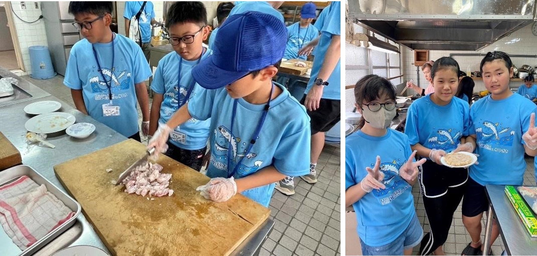 「たたっこ」は、島野浦島で古くから作られている郷土料理で、アジなどの魚を包丁で粘りが出るまでたたき、味噌とお好みで玉ねぎや生姜などとよく混ぜたものです。たたっこにはこの魚を使うという決まりはなく、おいしいのに「サイズが不揃い」「漁獲量が少ない」などの理由で、市場に出回らずに利用されない未利用魚を活用することが多いそうです。この日は島野浦で獲れたマダイ、ニベ、ヤリイカを使いました。また、台風の影響で野菜が手に入らず、みじん切りしたピーマンも入れました。子供たちは、順番に包丁を器用に使ってたたいていきました。すると粘りがでてきて一つにまとまっていきます。すり身状になったら完成です。このまま生で食べても、揚げてもたたっこはまた風味がかわってつくねのようになり、魚が苦手と言っていた子供も揚げたたたっこなら食べることができました。豊かな海の恵みを無駄なくいただく方法を先人たちが考え、それが今も続いていることを知り、自分たちもこの豊かな海を守り未来へ繋いでいきたいという思いを強くしたようでした。