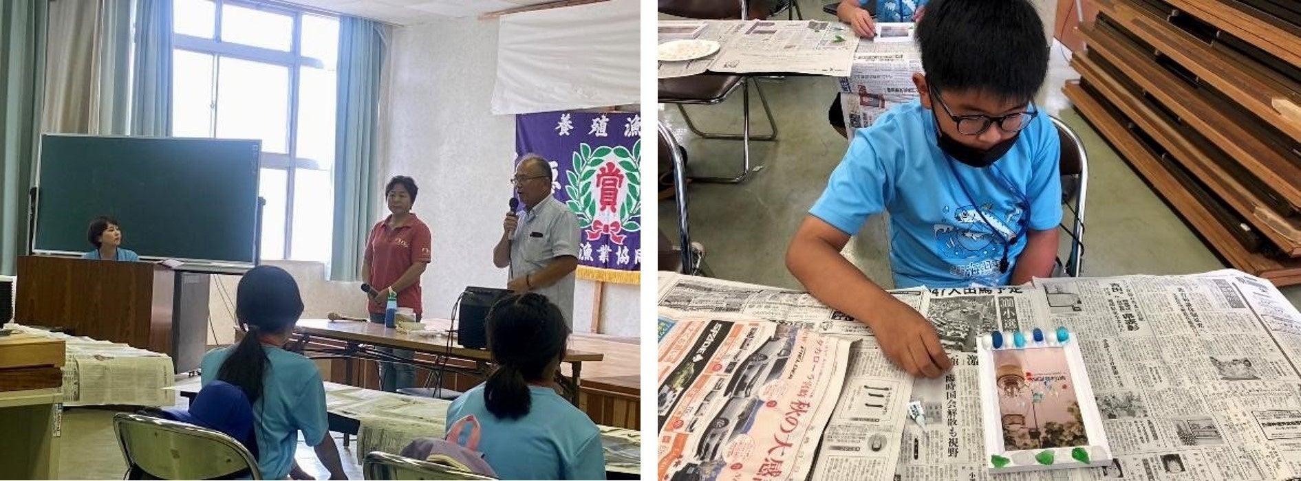 離島センターに移動し、シーグラスやサンゴ、貝殻など、海に漂着したものを使ってアート作品を作るマリンクラフトを行い、2日目のシュノーケリング時に撮影する写真を入れるフォトフレーム作りを行いました。