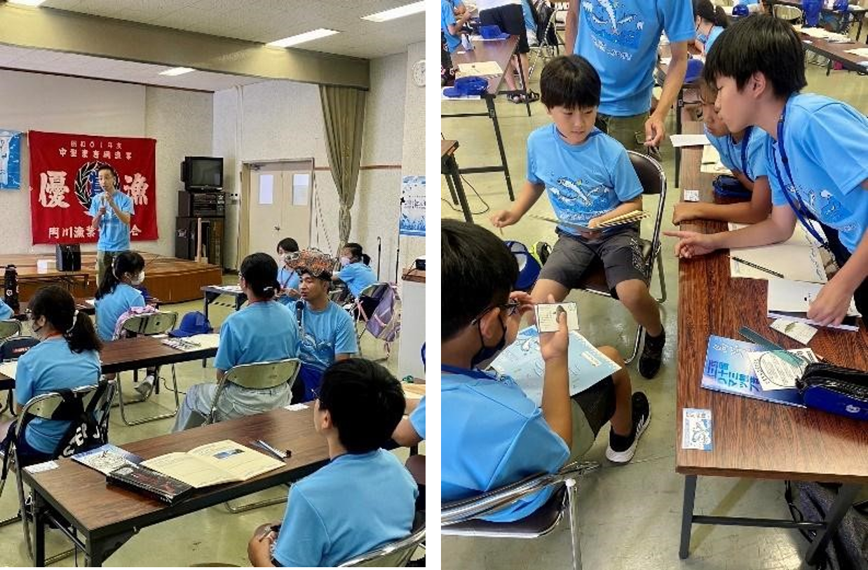 本来タイ・カンパチの養殖場を見学するスケジュールでしたが、台風6号の影響で海が時化て船を出すことが出来ず、離島センターで村瀬先生による魚の授業が行われました。村瀬先生は、延岡市の土々呂にある宮崎大学の延岡フィールドで勤務されており、宮崎県の魚類の多様性に関する研究をしながら、宮崎の魚図鑑や、学習用カルタを制作しています。そのカルタを使って、日向灘に生息する魚を「暖かい海に住む魚」、「冷たい海に住む魚」、「中間の海に住む魚」で分類するゲームをしました。わからないことは、村瀬先生やさかな芸人ハットリさんに質問し、それぞれが予想した後、図鑑を使って正しい生息エリアを導き出しました。黒潮と親潮の栄養を含んだ海が混ざり、多様な魚が生息することを知ることができ、子供たちはそれぞれ文章や絵で考えをまとめ、学習ノートに記入していました。