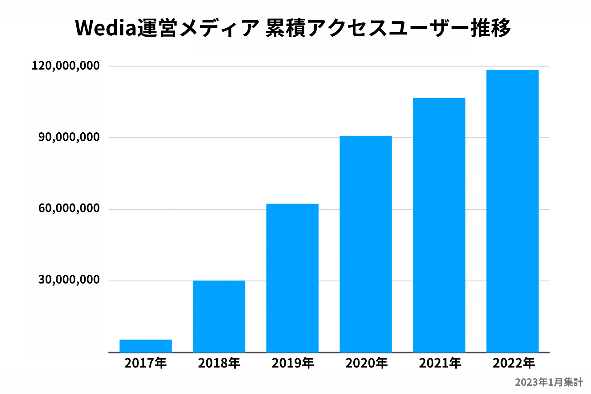 株式会社Wediaが運営するメディアの累積アクセスユーザー数が1億人(100,000,000人)を突破したことを報告します。(集計期間2017年1月〜2023年1月)