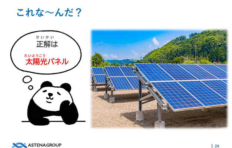 今回当社ではSDGsゴール17の内、ゴール1「貧困をなくそう」、ゴール13「気候変動に具体的な対策を」をテーマとした再生可能エネルギーの概要の説明及びアステナグループとしての取組や各国における貧困問題をクイズ形式によって授業を実施しました。