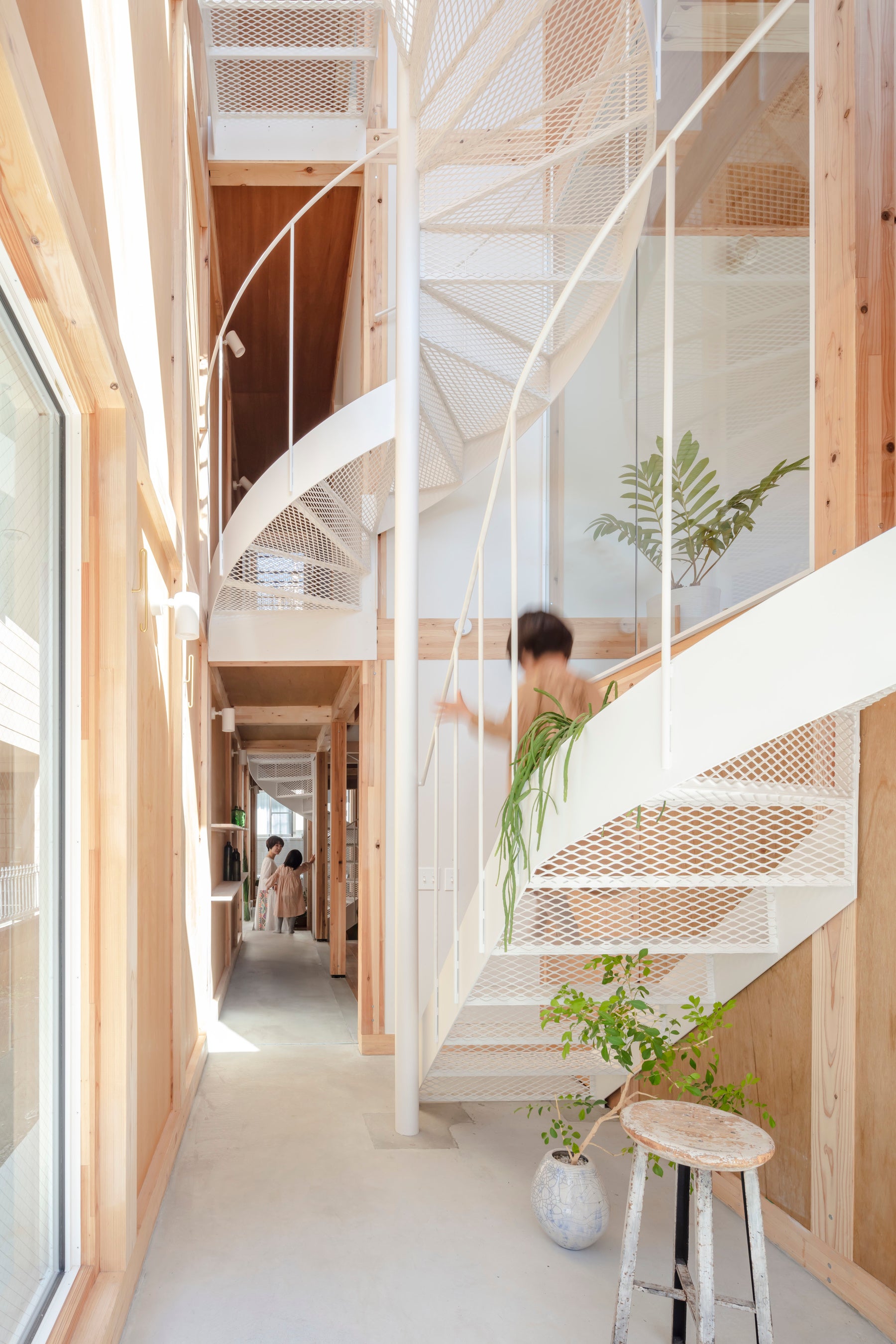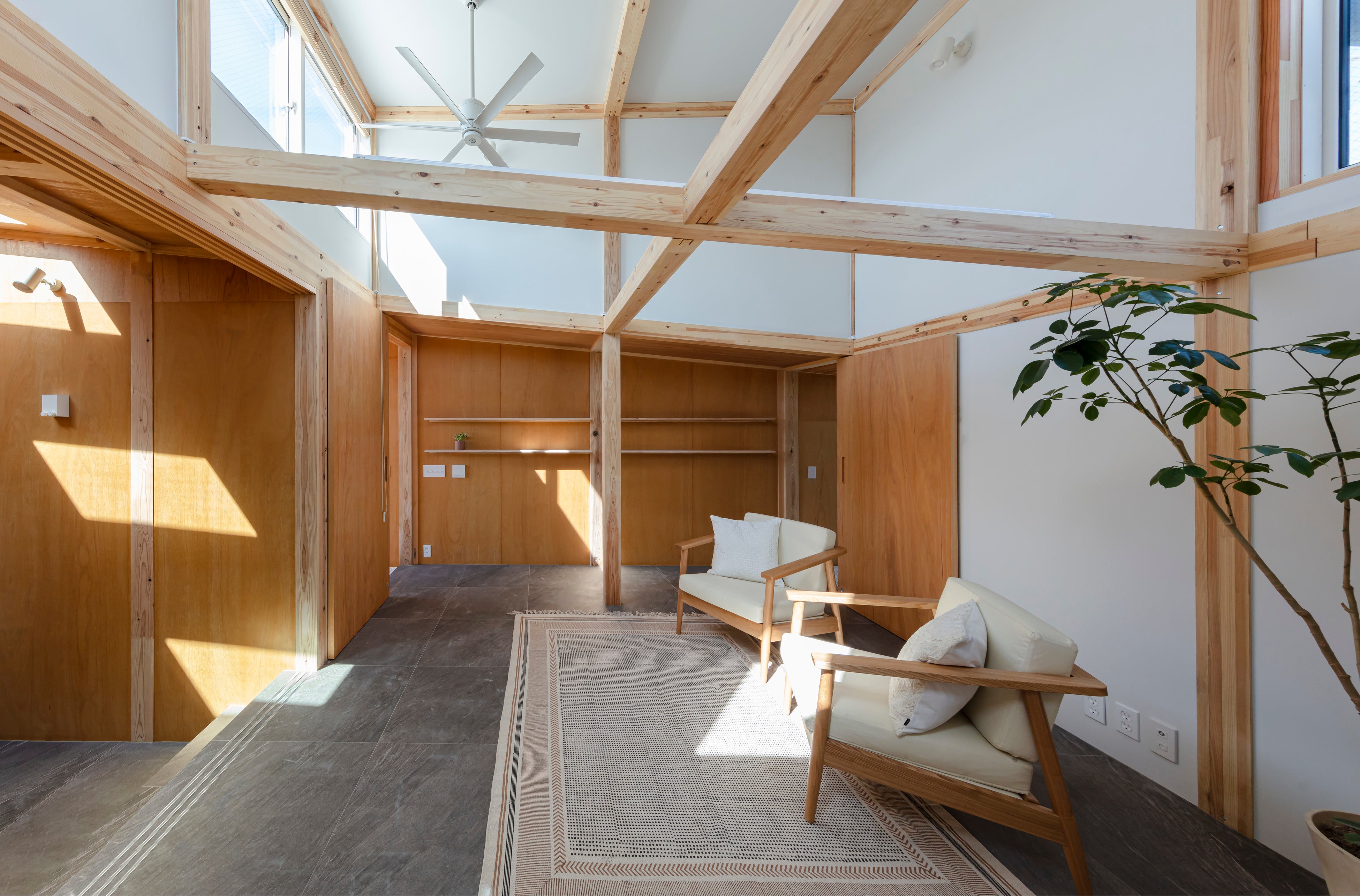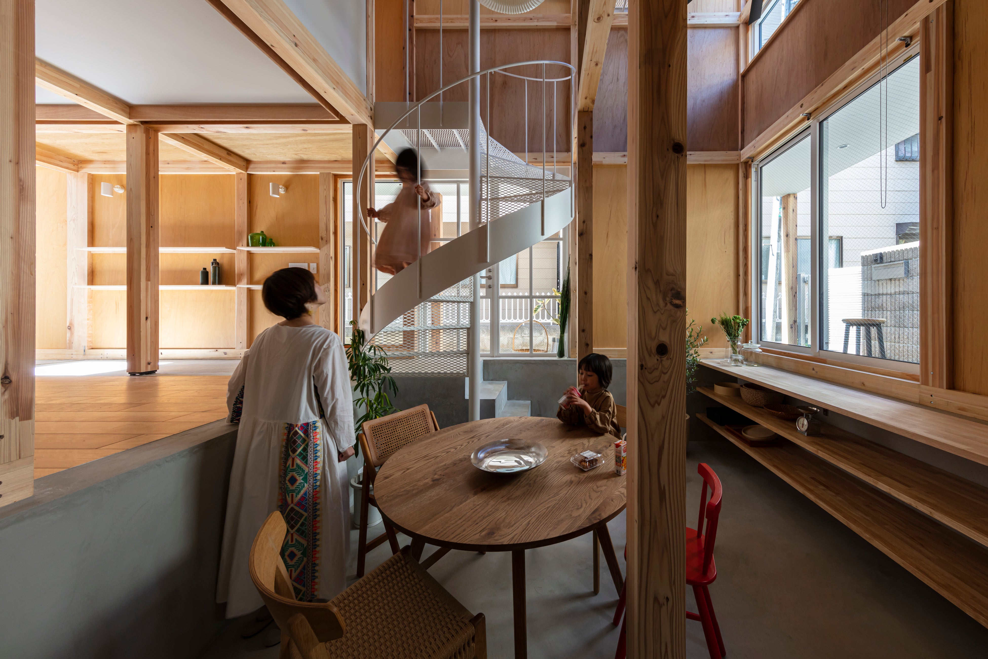 室内は準防火地域3階建てでありながら、日本民家の真壁を許容する告示を利用し「木のグリッド」を構成し、そこに引掛けるようにフロアを配しています。部屋同士を移動する際には必ず吹抜けや階段を通るため、密実な計画に見えて部屋同士の距離を遠くに感じさせます。1階の土間は縁側や半地下を作り出し、木のグリッドの合間を様々な形の階段が横断します。それらはツリーハウスに住むように様々な空間を生み出しています。