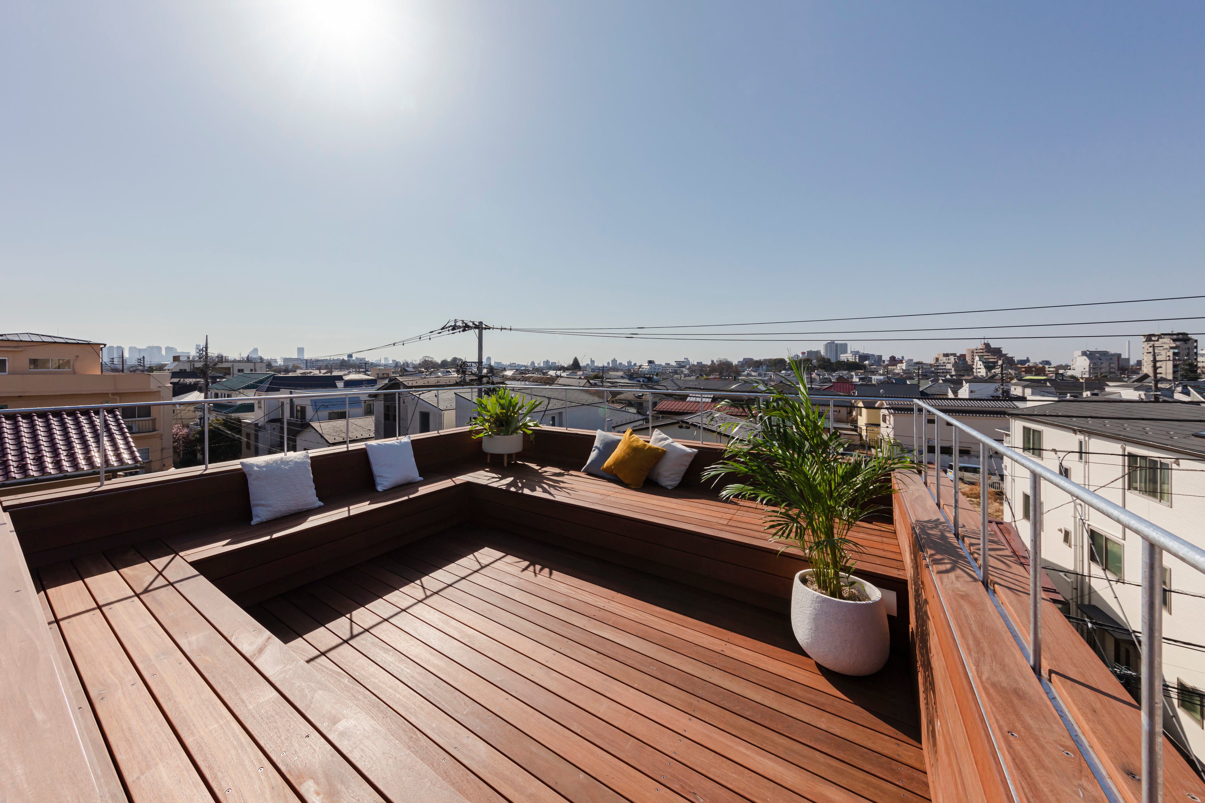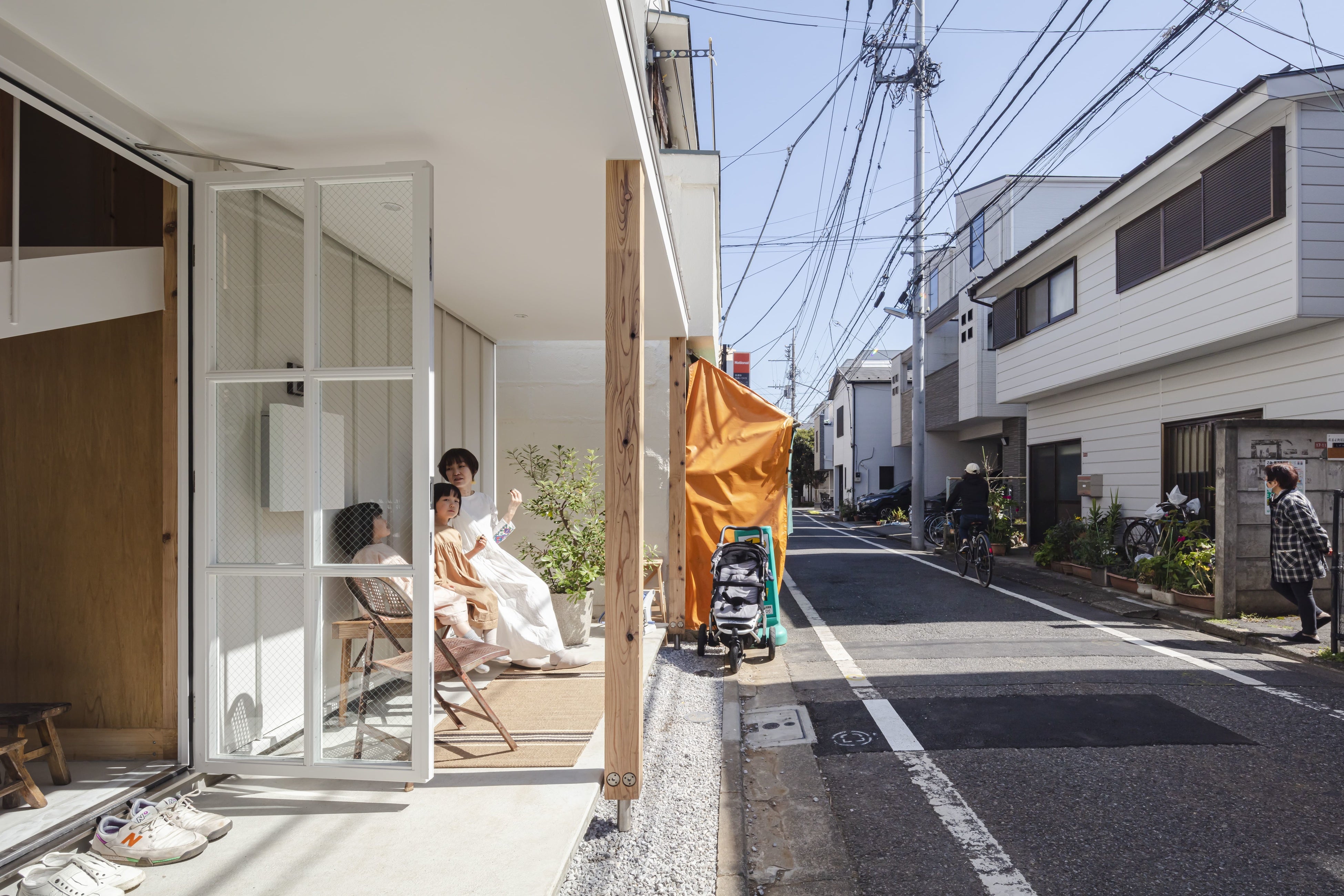 敷地はかつて商店街だった通りに面し、周辺には奥の住宅街に入り込む小道が通っています。そこにと土間による「パーゴラ」(日陰棚)を廻し、周辺地域との距離と関係に応答する場の創出を考えました。前面側と小道側に2つ玄関を持ち、それらを繋げるようにひとつながりの部屋の連続が中央の「塔」のボリュームを取り巻く様に立体的に登って、降りてきます。ほぼすべての扉は施錠が可能となっていて、空間を簡単に分節することができます。