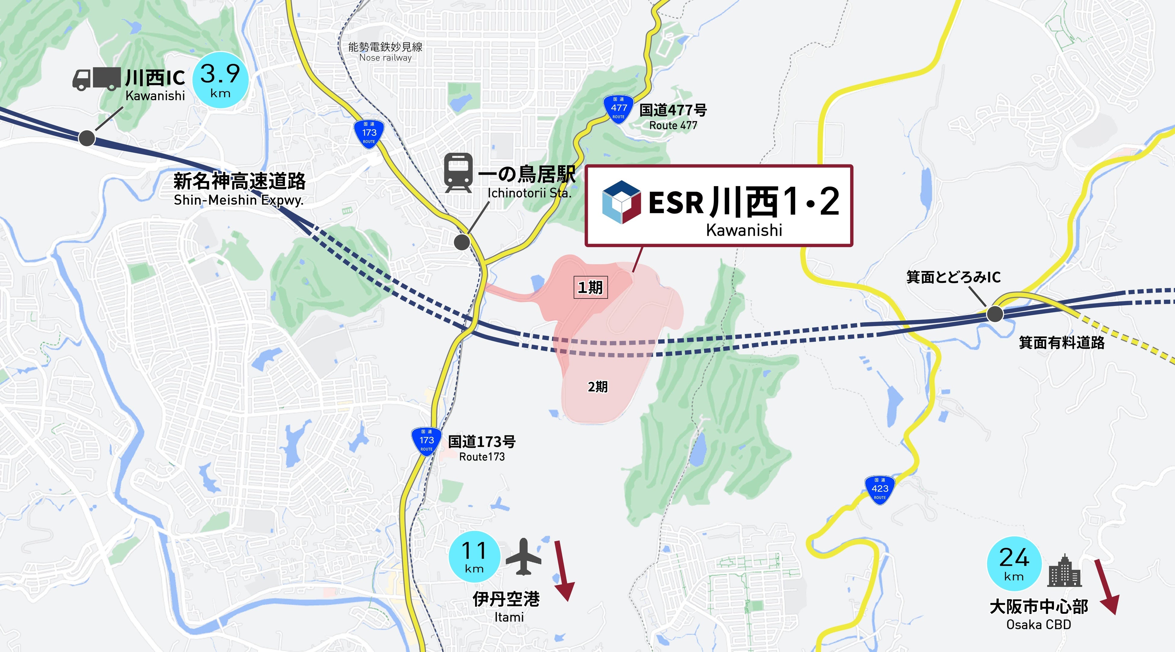 川西市北部・舎羅林山(しゃらりんざん)の北側、国道173号線沿いに位置し、新名神高速道路「川西IC」より3.9km、国道173号線経由で「池田木部IC」(5.1km)から阪神高速11号池田線を利用して大阪国際空港(伊丹)に11 kmと近接。また、新名神高速道路「箕面とどろみIC」経由で箕面有料道路や新御堂筋を利用することにより、北摂エリアまで10分、大阪中心市街地まで30分以内、神戸市、京都市までも1時間以内での配送が可能です。さらに、2027年度に予定されている新名神高速道路の全線開通後には神戸市~三重県四日市市が1本でつながり、東名・新東名のダブルネットワークが形成され、渋滞解消や所要時間短縮など交通利便性がさらに向上することが期待されています。