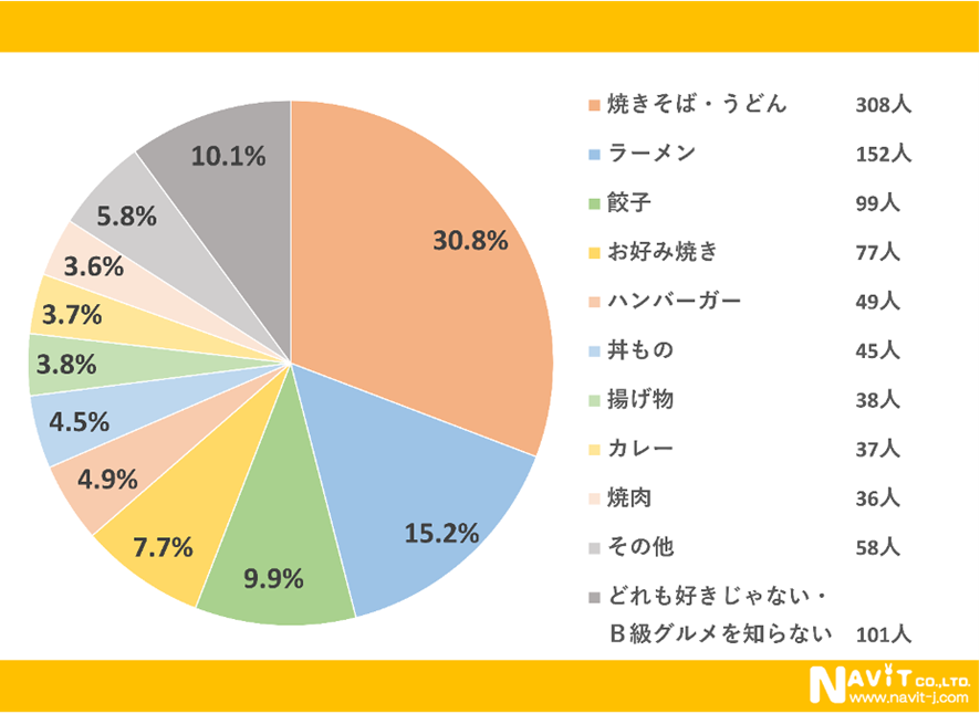 最も好きなB級グルメの1位は「焼きそば・うどん」で30.8%となっています。次に「ラーメン」が15.2%で麺類が大人気です。3番目に「餃子」が9.9%と続いています。上位3つは、前問での「B級グルメのイメージ」と同じ順位となりました。