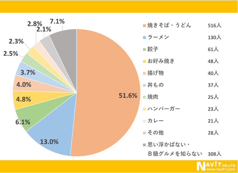 B級グルメでイメージが強いのは「焼きそば・うどん」が1番多く51.6%という結果になりました。半数以上の方がチョイスしたということになります。次に「ラーメン」が13.0%です。続いて各所で話題の「餃子」が6.1%と続いています。