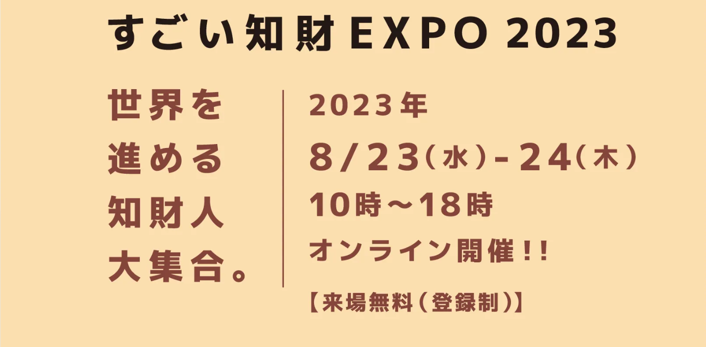 「すごい知財EXPO 2023」は、8/23(水)から8/24(木)に行われる完全オンラインによる知財のイベントです。