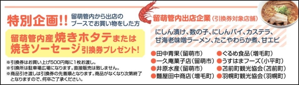 留萌地域から出店のブースでお買い物した方には500円毎に、留萌管内産焼きホタテまたは焼きソーセージの引換券1枚をお渡しします。