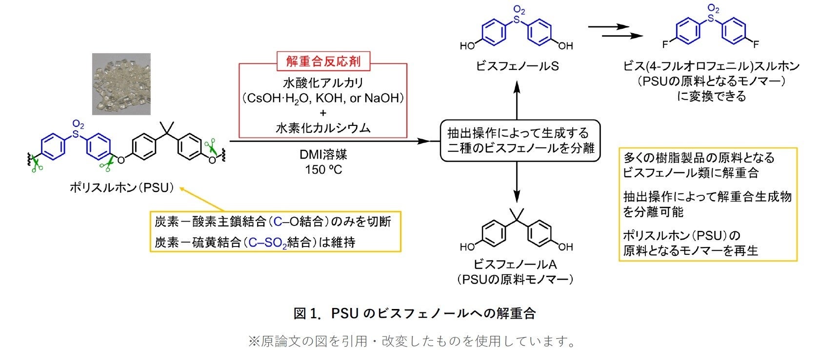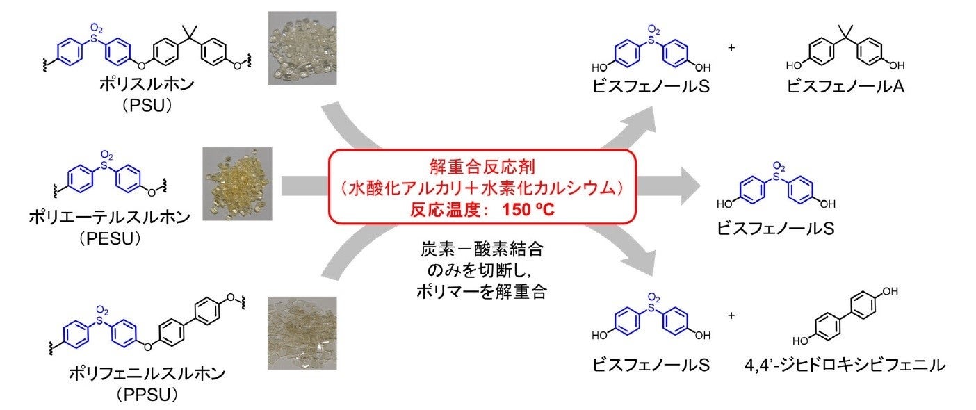 高機能熱可塑性樹脂、いわゆるスーパーエンプラは、耐熱性が高く、耐薬品性や機械的強度などの点で優れた性能をもっています。このスーパーエンプラの中でも、ポリスルホン(PSU)、ポリエーテルスルホン(PESU)、ポリフェニルスルホン(PPSU)などのポリスルホン樹脂は、耐薬品性を生かした医療用品、電気的特性と耐熱性を生かした電子機器部品、耐加水分解性を生かした食品加工分野など、素材の安全性が求められる製品において広く利活用されており、機能性部材としての成長が非常に期待されています。一方で、プラスチックが環境に与える大きな負荷がクローズアップされており、ポリスルホン樹脂などのスーパーエンプラについても環境負荷の少ないリサイクル技術が望まれています。しかし、スーパーエンプラは高い化学的安定性をもつため、分解して原料物質を再生することは困難です。