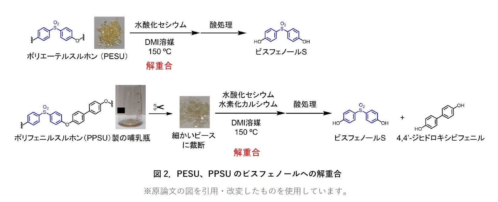 今回見つけた解重合反応は、PSUだけでなく、PESUやPPSUなどの他のポリスルホン樹脂、あるいはポリエーテルエーテルスルホン(PEES)、PEEKにも適用できます。例えば、PESUに対し、適量の水酸化セシウムとDMIを用いて150 ℃で4時間反応させると、ビスフェノールSが収率90%以上で得られます(図2上)。また、市販されているPPSU製の哺乳瓶についても、ボトルを細かく裁断し、適量の水酸化セシウムと水素化カルシウム、DMIを用いて解重合すると、ビスフェノールSと4,4’-ジヒドロキシビフェニルを含む解重合混合物が得られることを実証しました(図2下)。