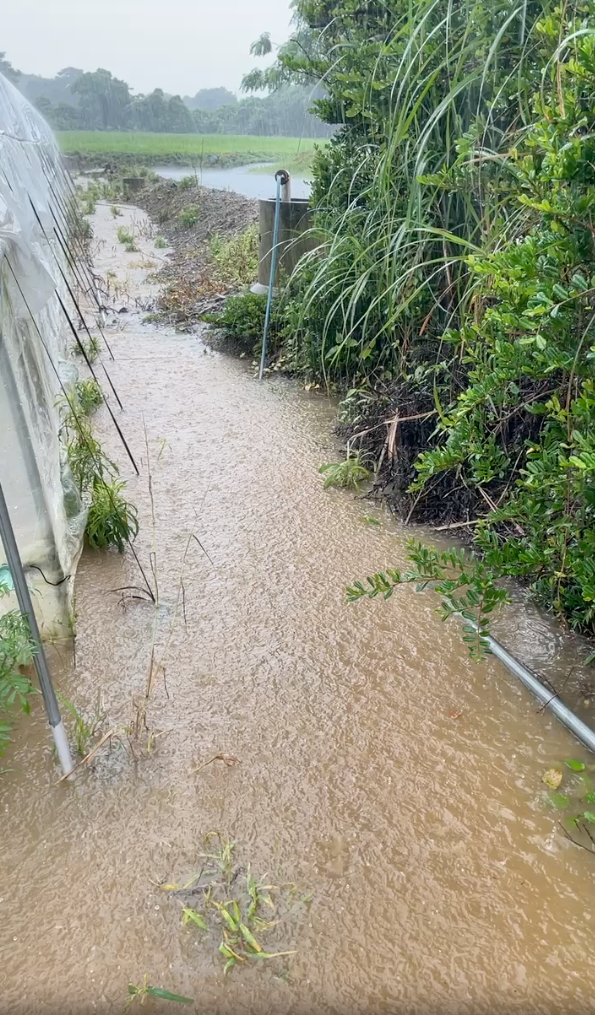 台風6号による影響により、農園のハウス2棟が浸水被害を受けました。また、植え付け直後の安納芋畑の苗が風で折れたり、吹き飛んでしまいました。幸いなことに、けが人はなく、スタッフ一同安全に避難できましたが、被害総額は250万円を超える厳しい状況となりました。
