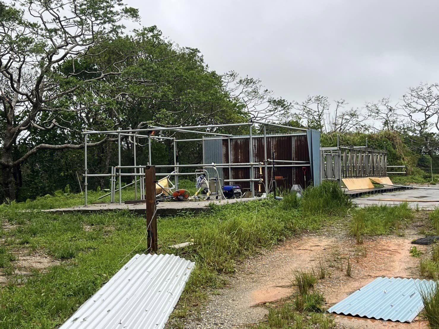 台風6号で甚大な被害が出ました。暴風でバナナ畑も木々が倒れ、トタン板が飛び、搾乳小屋も壊れてしまい機械も故障。現在は空の下で手絞り搾乳です。停電時はポンプが止まり、水を川から汲み上げられなくなってしまいました。