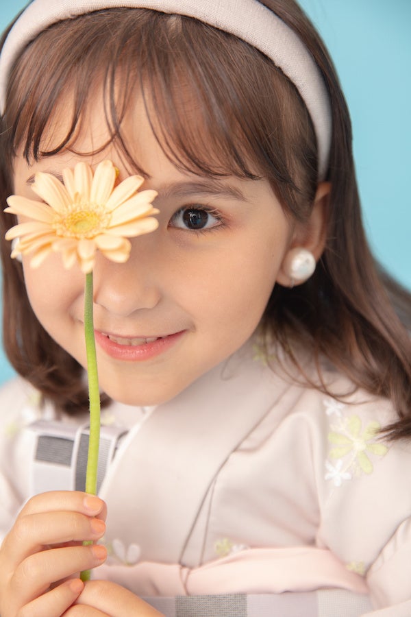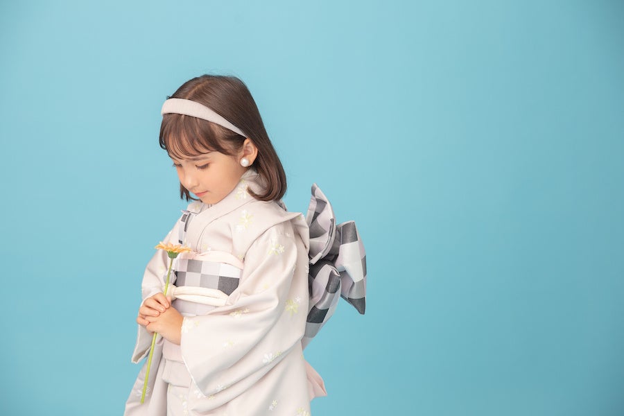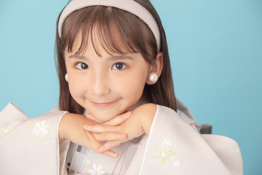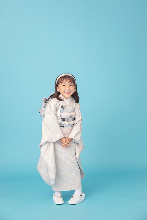 2023年の七五三は『rétro×feminine』シンプルな水色のペーパー背景に新作のグレーのお着物を合わせました。