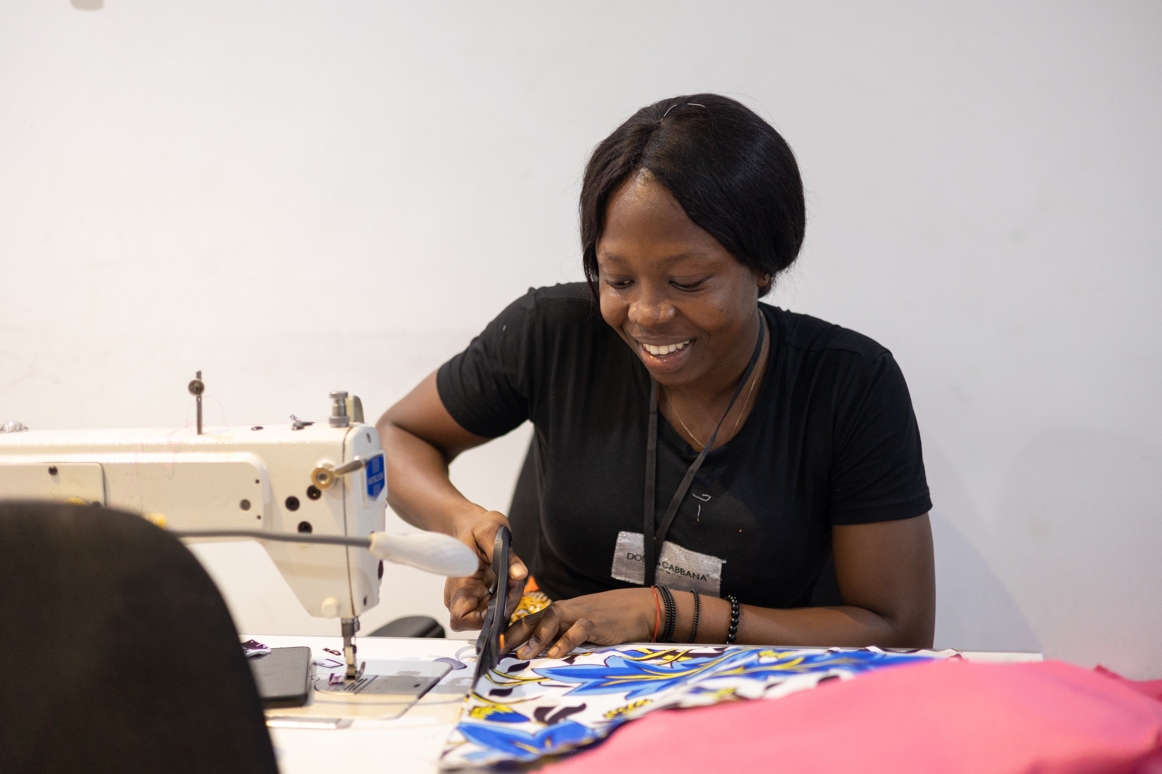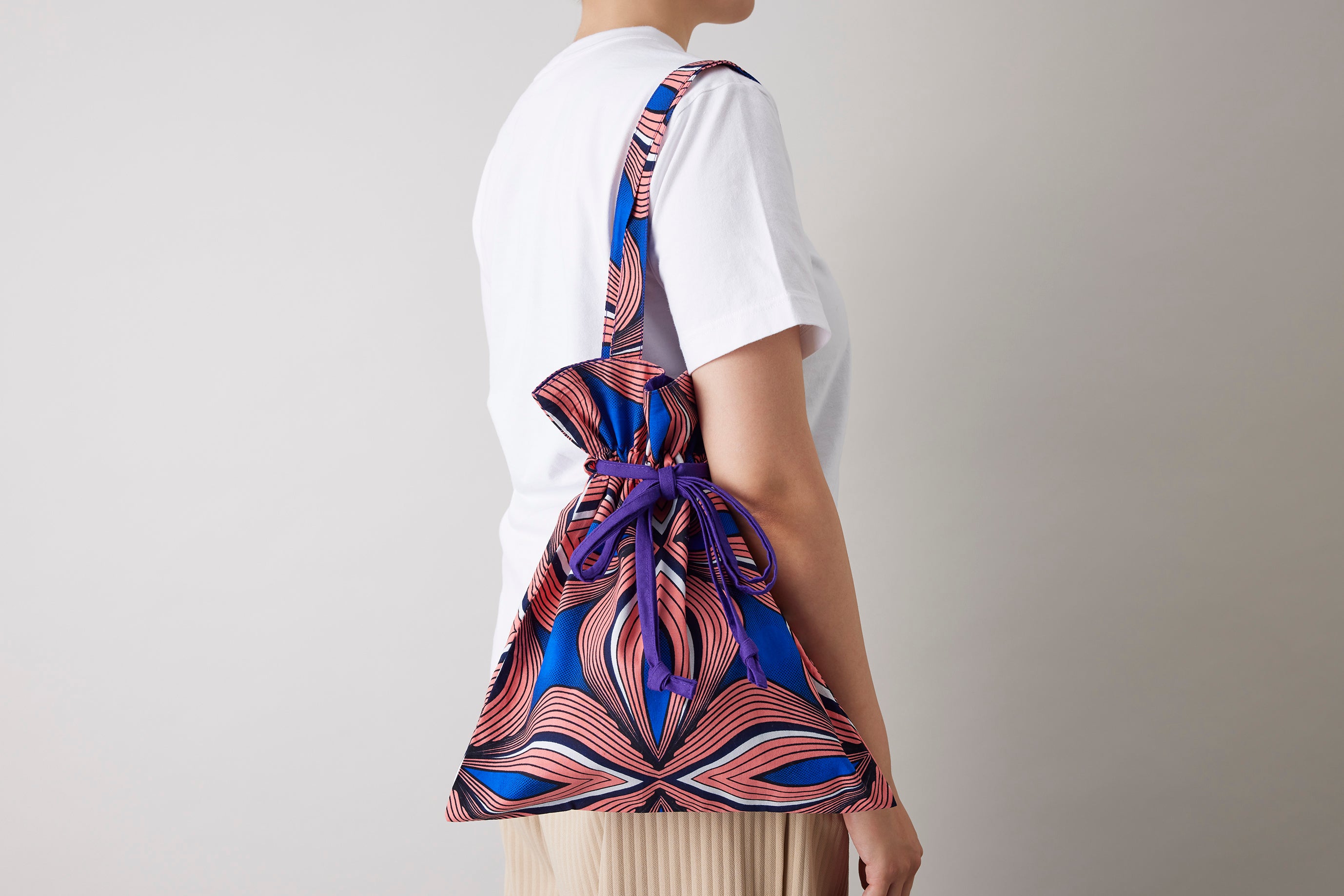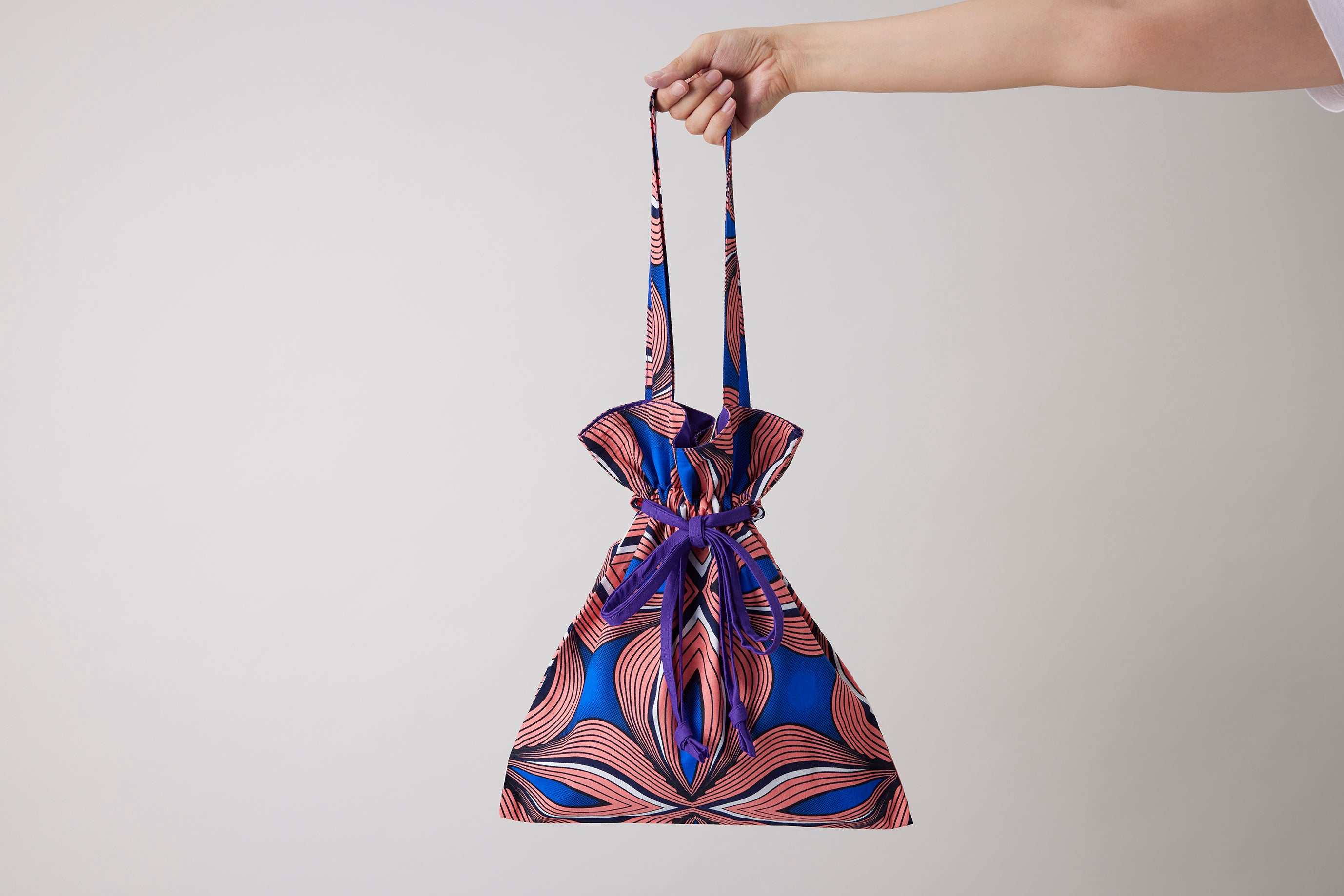 色鮮やかな生地は、ガーナ伝統のアフリカンファブリック「キテンゲ」。民族衣装として、儀式などでも幅広く使用されており、彼らの主張や表現がデザインに凝縮されている生地です。
