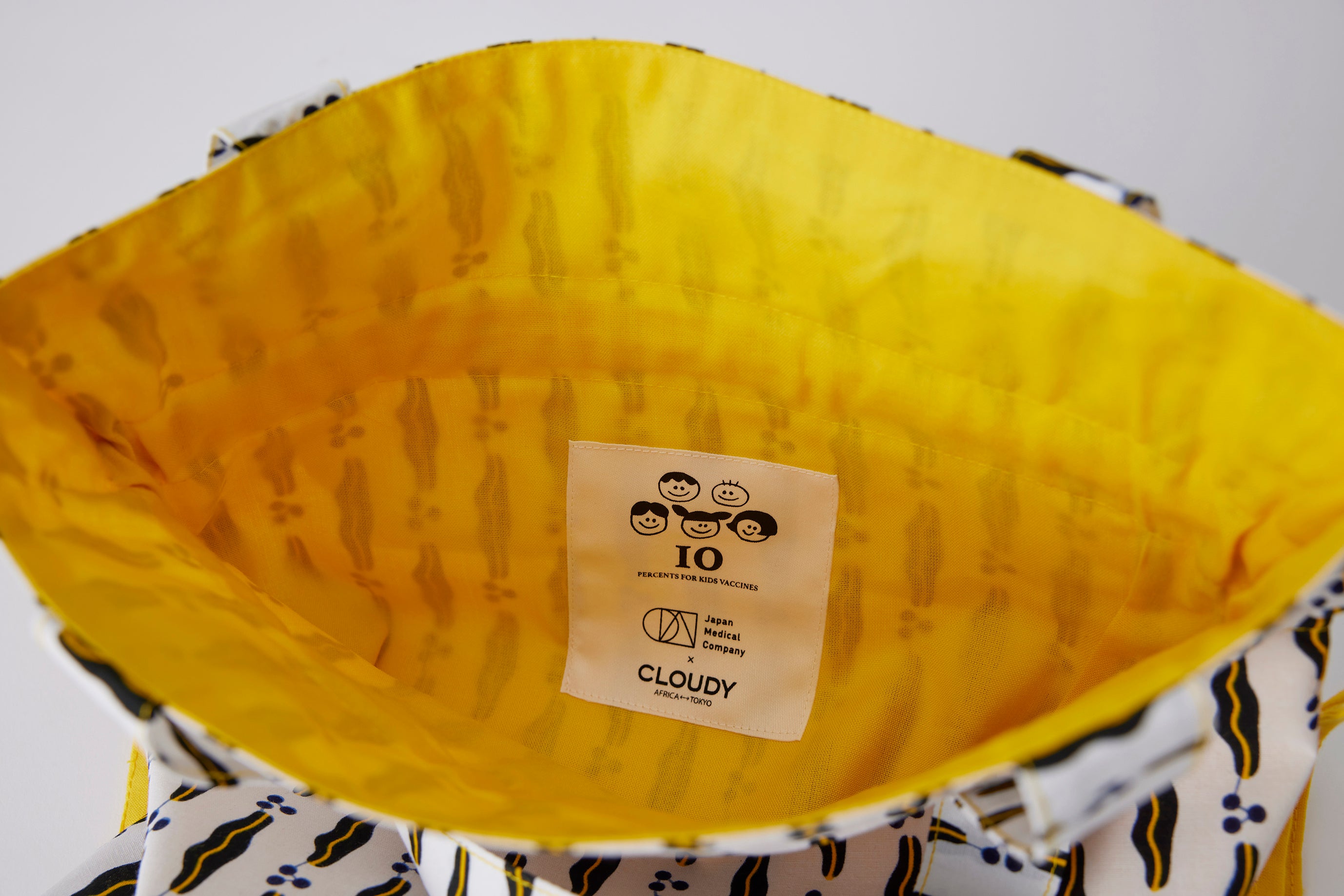 バッグの内側には、本プロジェクト特製のダブルネームタグを配置し、可愛らしい子どもたちのイラストと共に、小児ワクチン10回分接種への寄付を意味する「10」の文字がプリントされています。