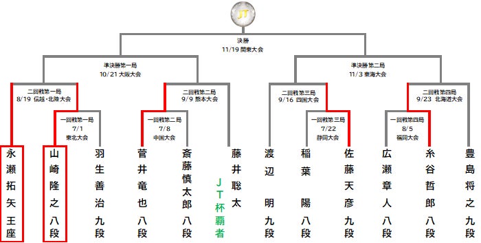 両者の対戦成績は、11戦して永瀬王座の8勝3敗。戦型は、角換わりが6局、相掛かりが3局、横歩取りが1局、山崎八段の陽動振飛車が1局。11局中先後があらかじめ決まっている順位戦の3局を除くと、永瀬王座の先手7局に対し、山崎八段の先手はわずかに1局。偶然だろうが、振り駒の結果はかなり偏っている。6局指されている角換わりはすべて永瀬王座が先手でのもの。山崎八段が先手になった2局については相掛かりとなっている。どちらが先手を持つかで予想も変わるわけだが、逆に言えば永瀬王座が先手なら角換わり、山崎八段が先手なら相掛かりになる公算が高いと思われる。持ち時間の短い早指し棋戦での対戦は過去1回もない。一回戦での逆転勝利に「次は堂々とファンの前に立ちたい」と言った山崎八段。一方、永瀬王座は「JT杯」初優勝を目指し今年の初戦となる。山崎八段の独創的な構想に対して、永瀬王座がどう対応するのか。 「JT杯」の舞台では初対決のこの一番に注目だ。