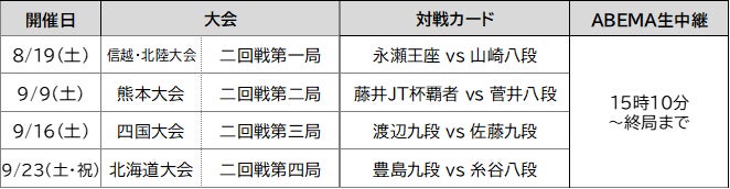 二回戦第一局生中継「ABEMA」URL https://abema.tv/channels/shogi/slots/DQ4etXqyQ3k5FD
