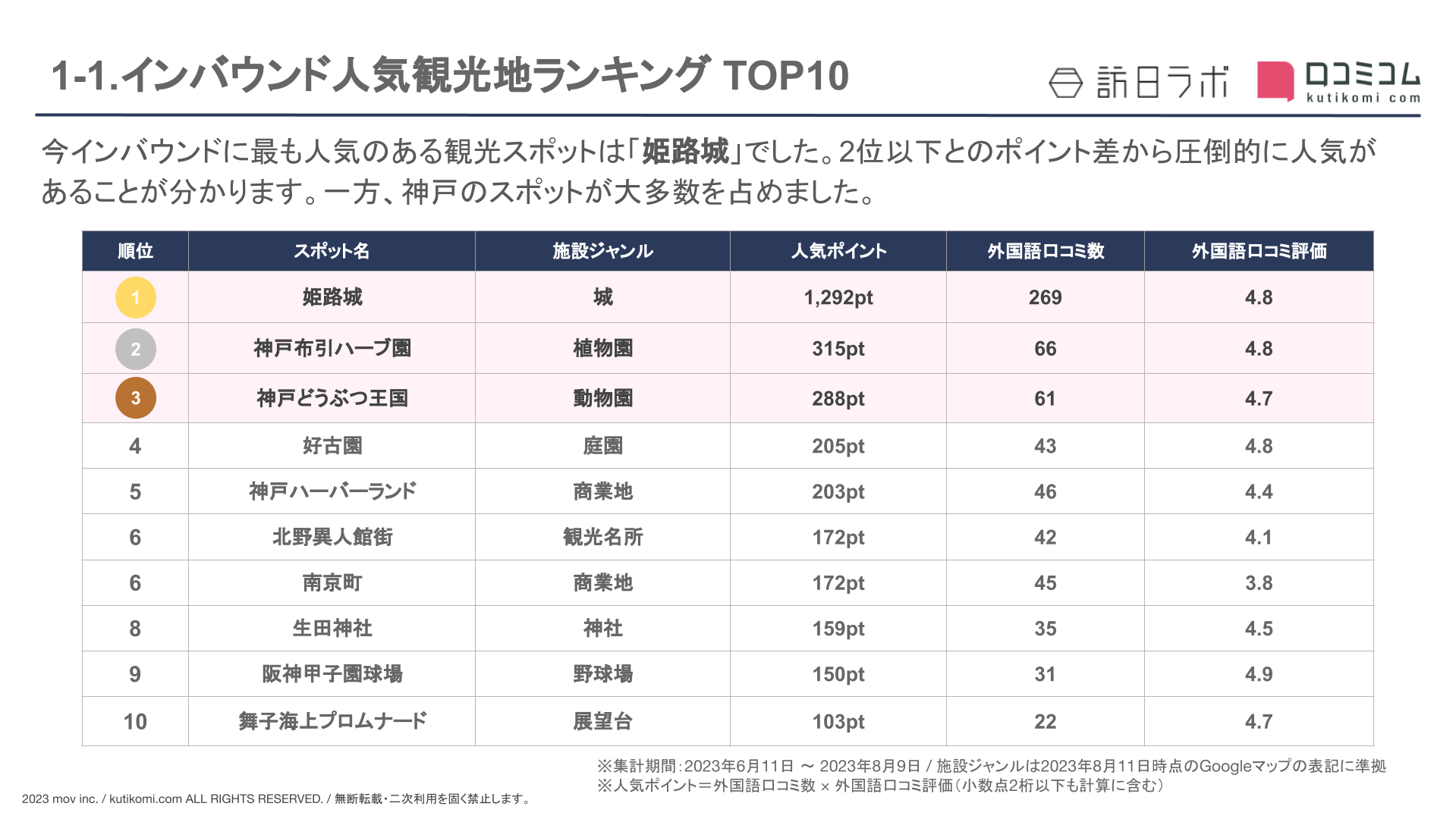 また、TOP10の半数以上が神戸市内のスポットであることが分かりました。