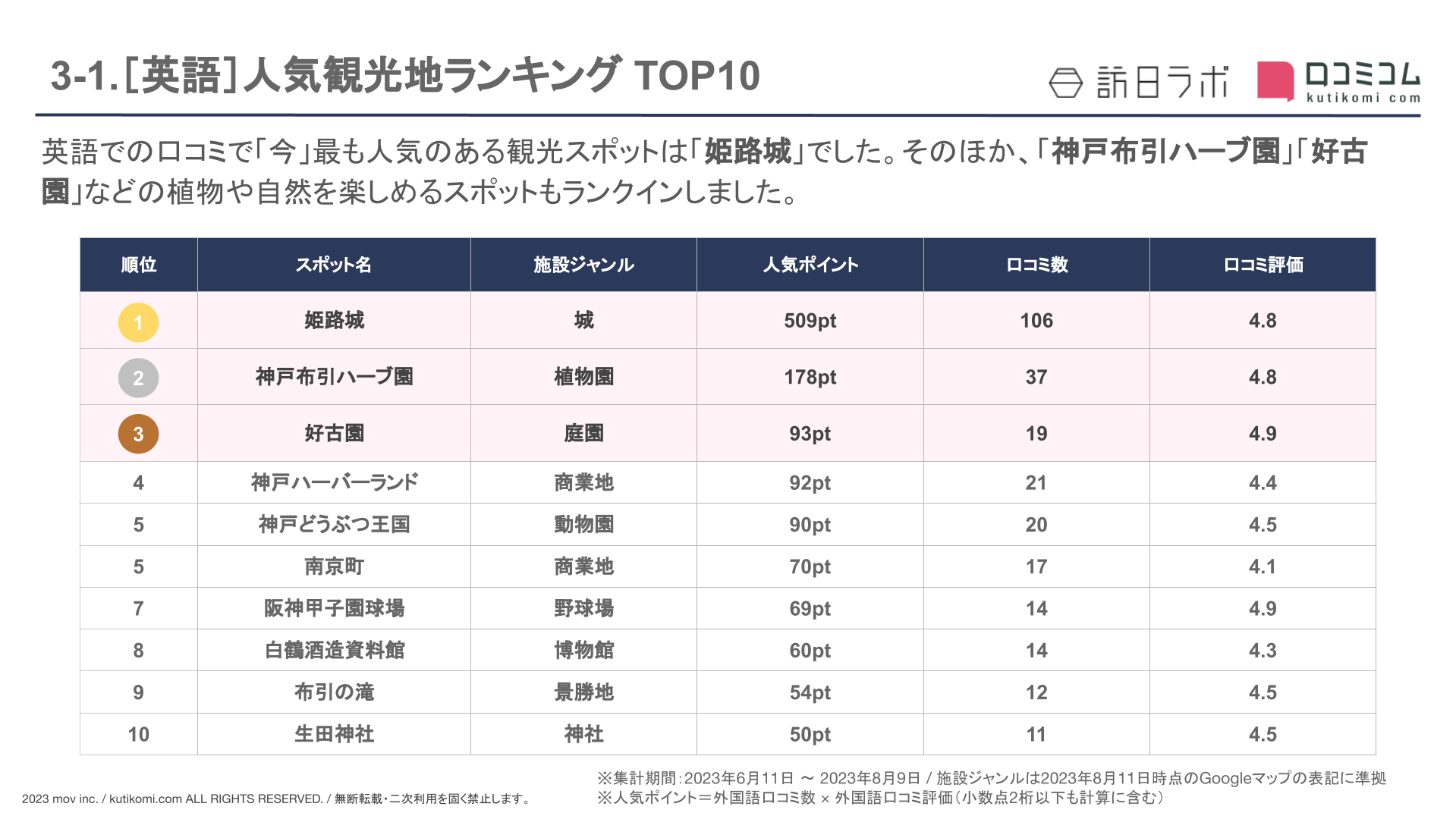 英語での口コミで「今」最も人気のある観光スポットは「姫路城」でした。そのほか、「神戸布引ハーブ園」「好古園」などの植物や自然を楽しめるスポットもランクインしました。