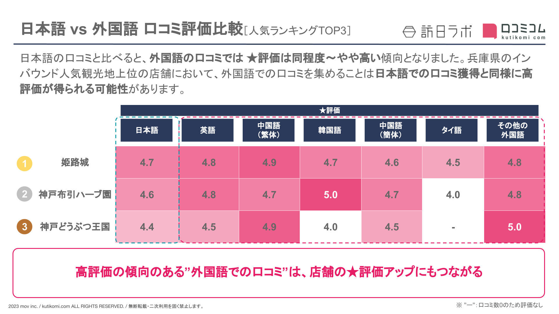 日本語の口コミと比べると、外国語の口コミでは ★評価は同程度〜やや高い傾向となりました。兵庫県のインバウンド人気観光地上位の店舗において、外国語での口コミを集めることは日本語での口コミ獲得と同様に高評価が得られる可能性があります。