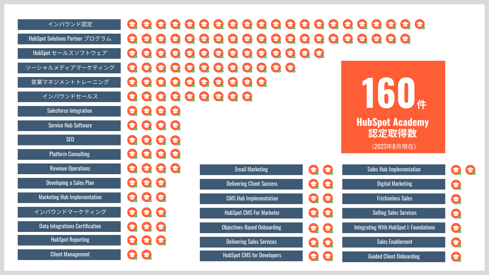 当社の社員は、職種に関わらず、HubSpot Academyを全社の教育プログラムとして組み込んでおり、日本語・英語含めたHubSpotに関するさまざまな学習を経て、認定資格の取得と更新を実施しています。今回のHubSpot Elite Parter認定の条件のひとつ「チーム全体でのHubSpot Academy認定取得数:100件以上」をはるかに超え、現在160件の認定資格を保有するメンバーが在籍しています。