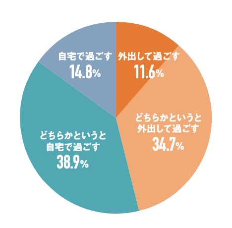 自宅で過ごす割合がわずかに多いという結果となりました。2022年11月実施の調査でも自宅で過ごす割合は55%と半年間での変化は特に見られていません。