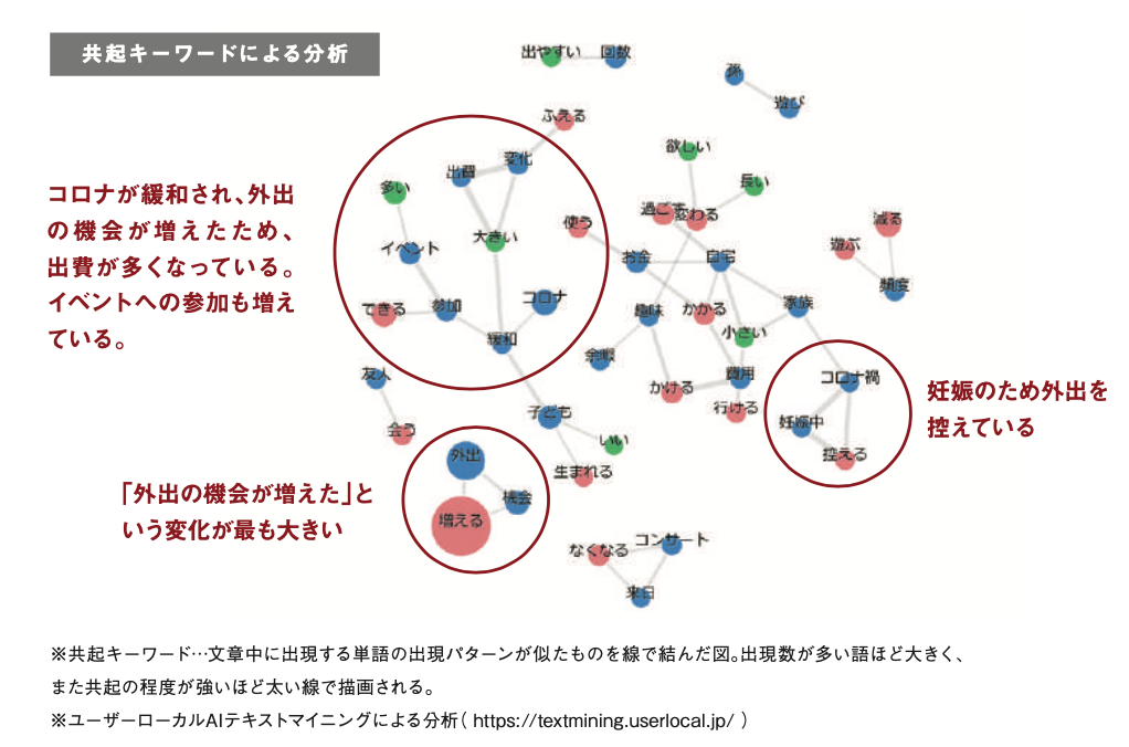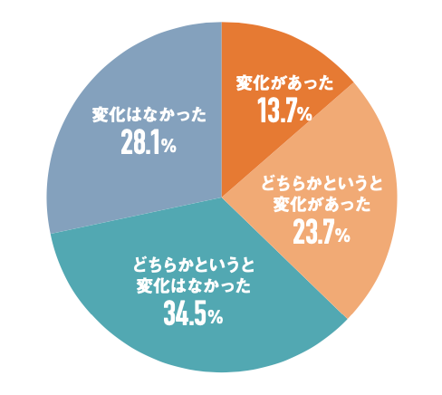 「変化がなかった」回答が6割だが、4割は変化があったと回答。具体的な変化については、コロナが落ち着いてきたため外出が増えた、外食が増えた、人混みやコンサートに 行くようになったという声。反対に、コロナで出かけないことが定着し、家でゆっくりするようになったという意見もありました。