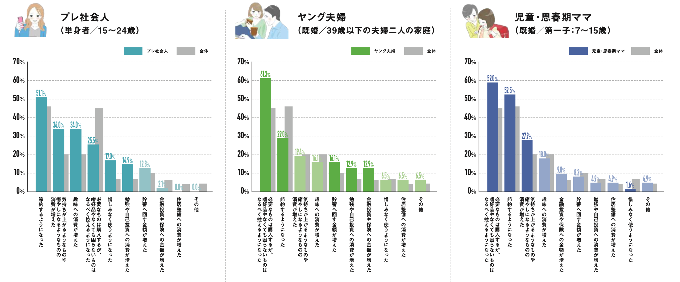 「プレ社会人」では、節約意識はあるものの自由に使えるお金があるため、惜しみなく使い、気持ちが上がるもの癒やしになるもの、または趣味に対する消費が非常に高く勉強や自己投資への意識が高いといった傾向がみられました。「ヤング夫婦」では普段の嗜好品などの購入は控えているが、必要なときには使い、節約するという意識は全クラスターの中で最も低く貯蓄や金融投資への関心が高いといった傾向。「児童・思春期ママ」の場合は、節約への意識は全クラスターの中で最も高く、嗜好品においても節約の意識があり、気持ちが上がるようなものや癒やしになるものを購入することで気持ちのバランスを取っているといった傾向がみられました。それぞれの属性の消費行動を深く理解することで、どんなサービスが必要か戦略が変わってくると言えます。