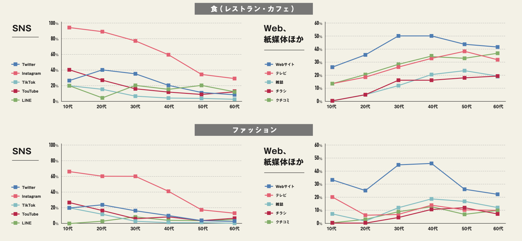 全世代、食・ファッションともに情報収集のツールとしてInstagramがトップの結果となりました。YouTubeは若年層と相性がよく、年齢が上がるにつれてゆるやかに下降。LINEは20代で減少の傾向、代わりにtwitterが用いられていることが分かります。TikTokは10代〜20代のみの使用となっており、若年層との相性がいいことが推察されます。コンテンツ別に見てみると、「食」の場合は、SNSだけではなくWeb検索やテレビ、クチコミなど様々な媒体で情報収集が行われていること分かります。その背景として、商品やお店など限定せずに知らない情報を得るために検索を行っていることが理由として考えられます。「ファッション」の場合は主にInstagram、Web検索どちらかからの情報収集が行われています。30〜40代ではInstagramに加えてWeb検索も多く、Webで情報収集を行った後足りない情報をInstagramで取りに行くといった流れが背景にあると考えられます。