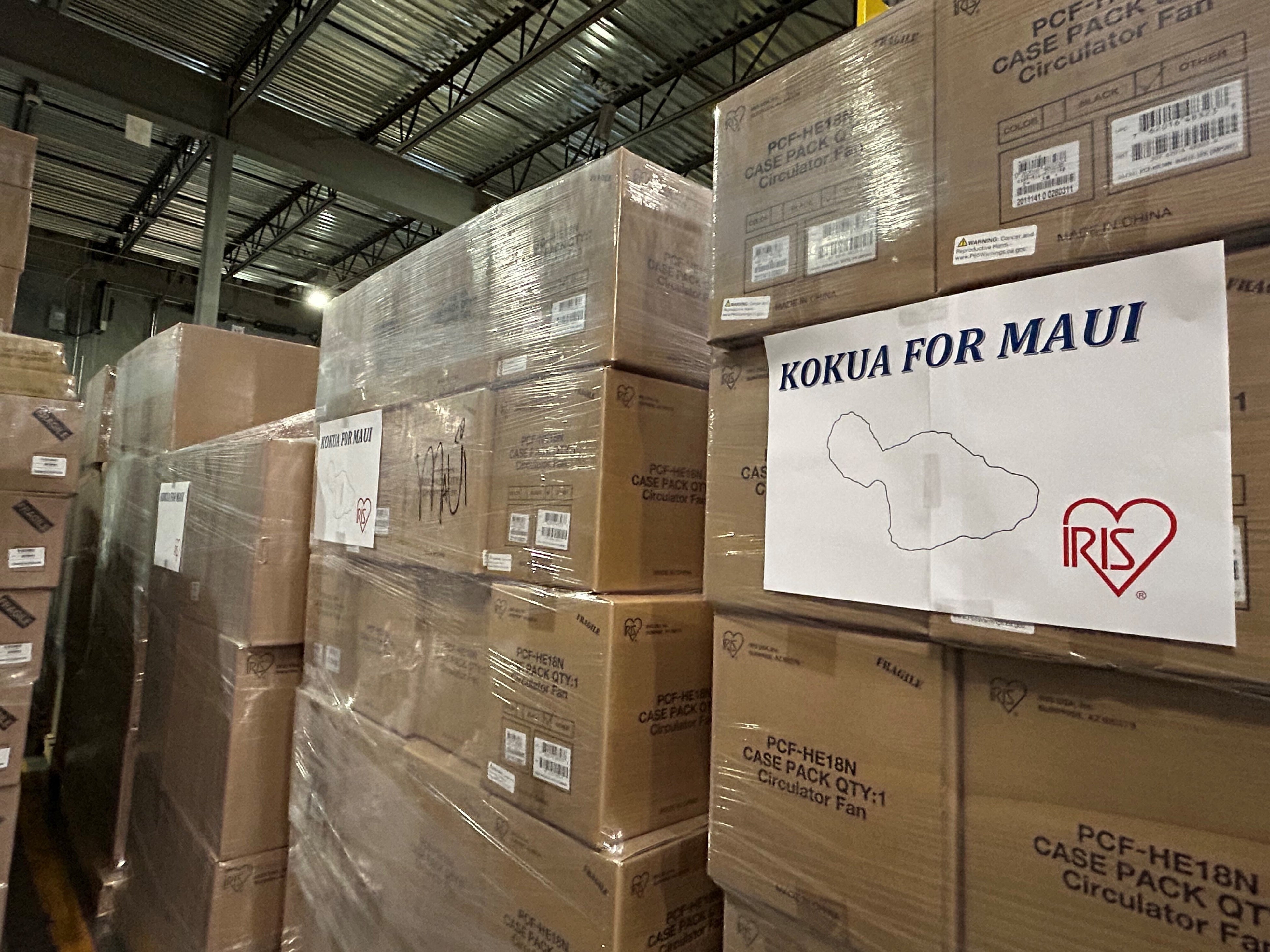 アイリスグループのIRIS USA,Inc.(本社:アメリカ合衆国アリゾナ州サプライズ市、社長:髙橋 博之)は、ハワイ州マウイ島における火災被害により避難を余儀なくされている方々を支援するため、ハワイ州の財団法人(Hawaii Webco Foundation)を通じてマウイ島の救援活動団体(Maui Relief Efforts)に支援金1万ドルを寄付することを決定しました。また、被災地で必要としている米と収納用品、サーキュレーター等の支援物資(※)を加えて、マウイ島内の避難所への配送手配を進めています。
