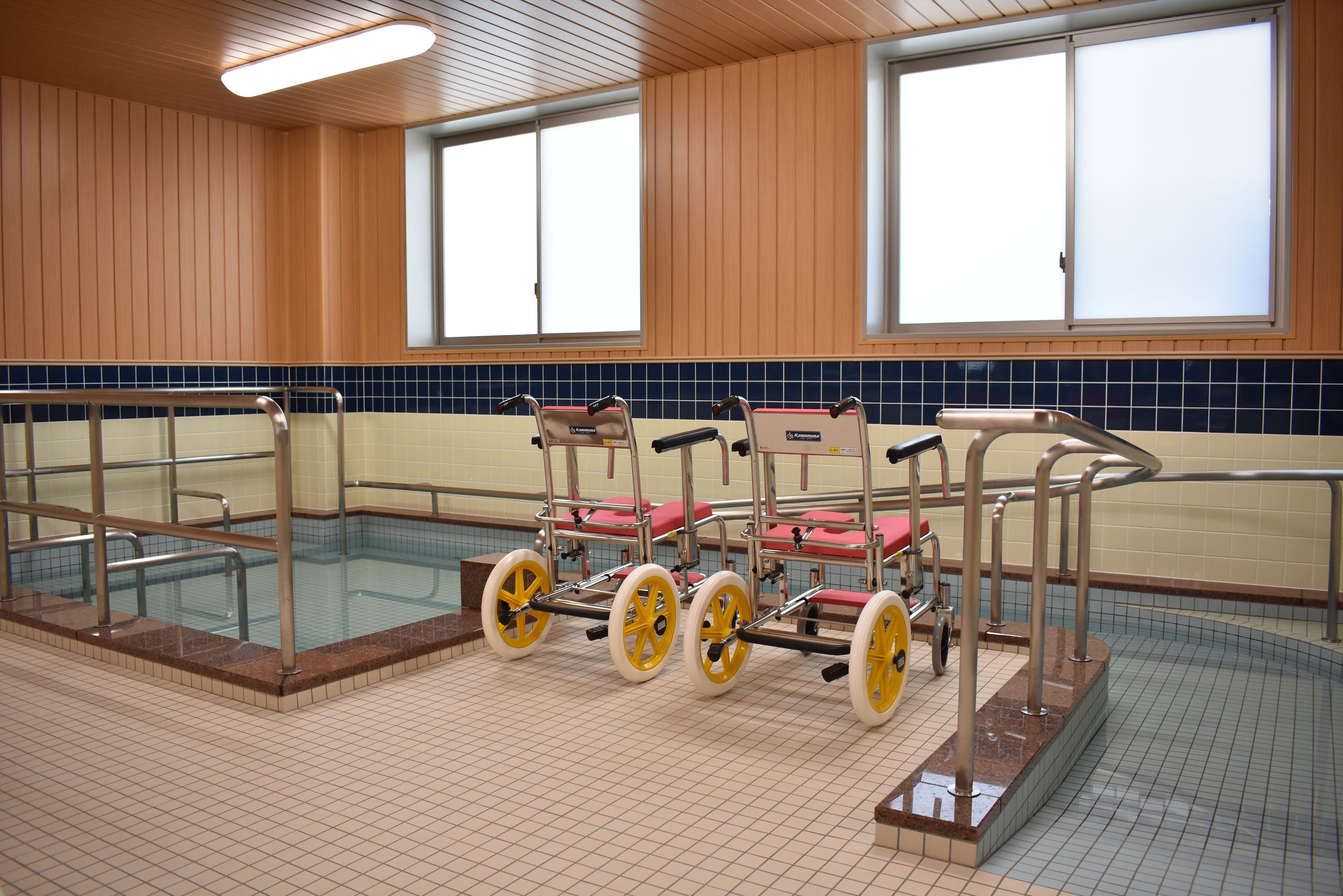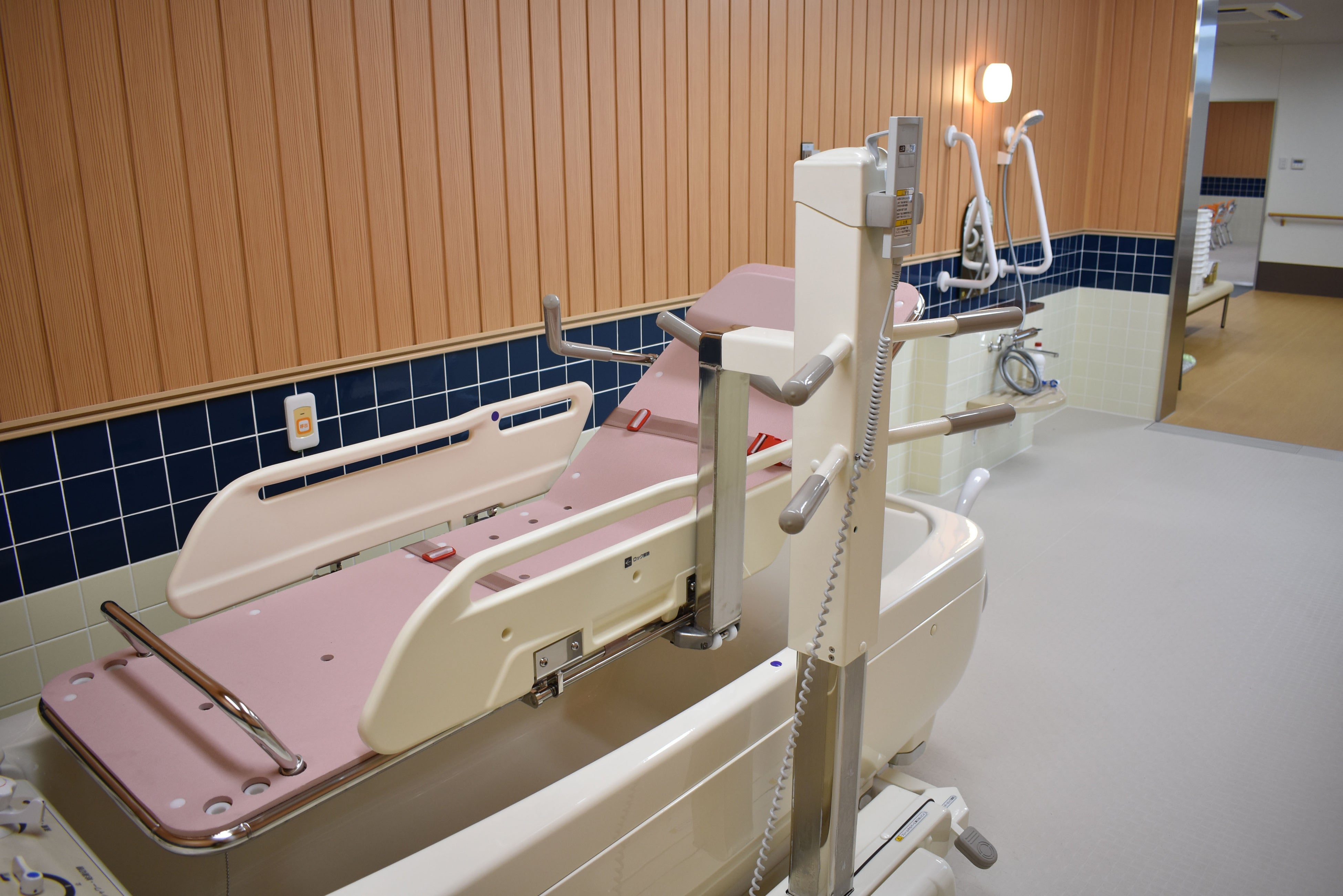 大浴場には浴室用車いすのまま浴槽に入れるようスロープを配置し、可能な限り大きなお風呂でゆったりと入浴いただけるよう工夫しています。もちろん、寝たきりの方にもご入浴していただけるよう、機械浴槽もご用意しています。