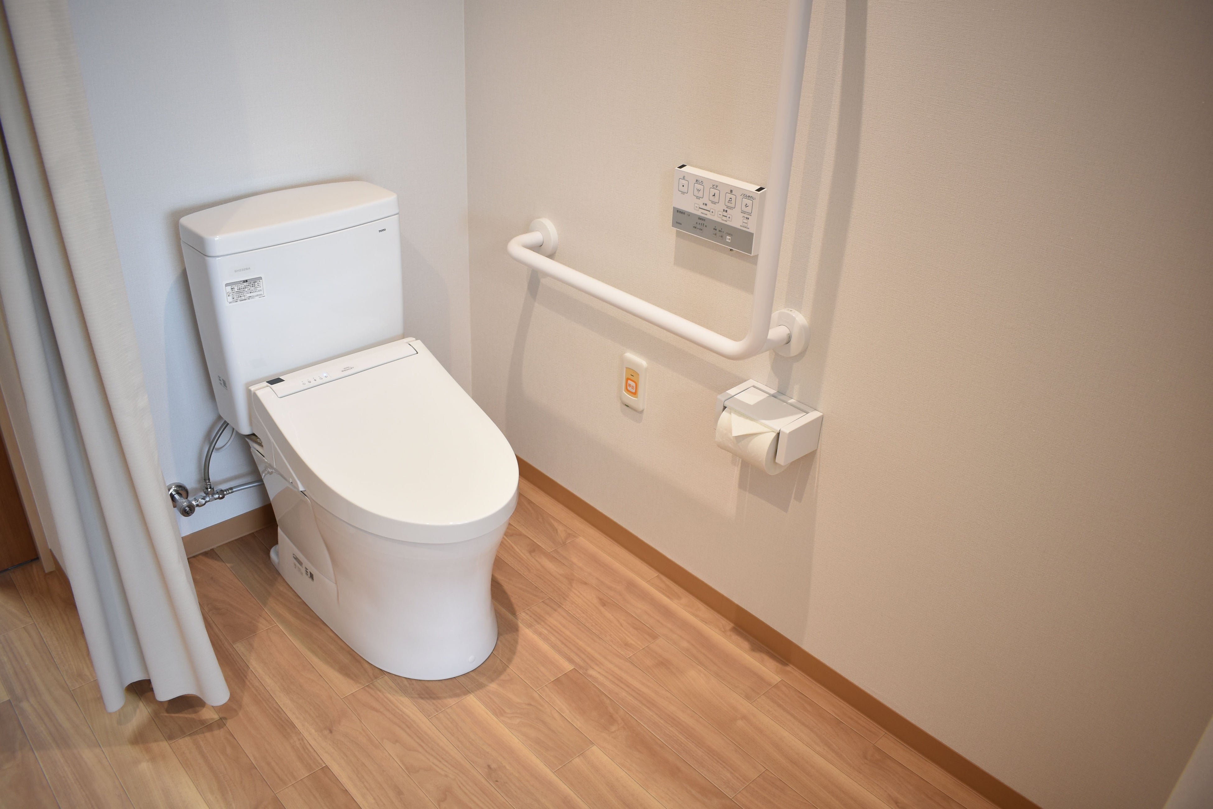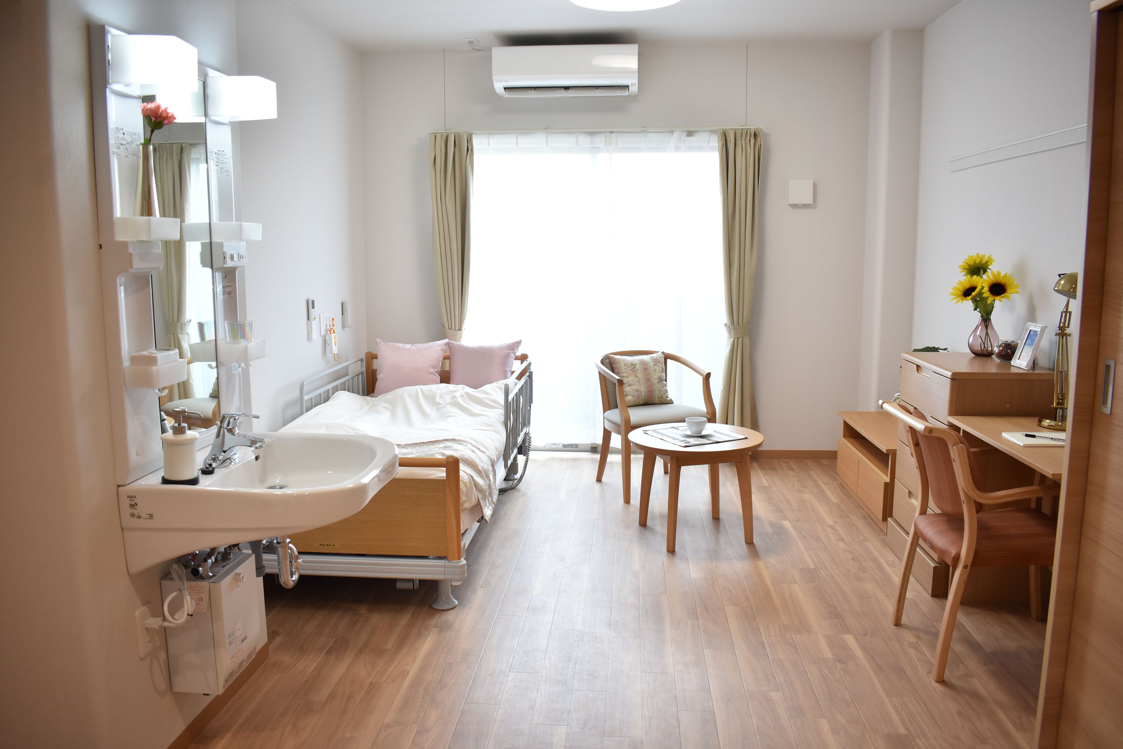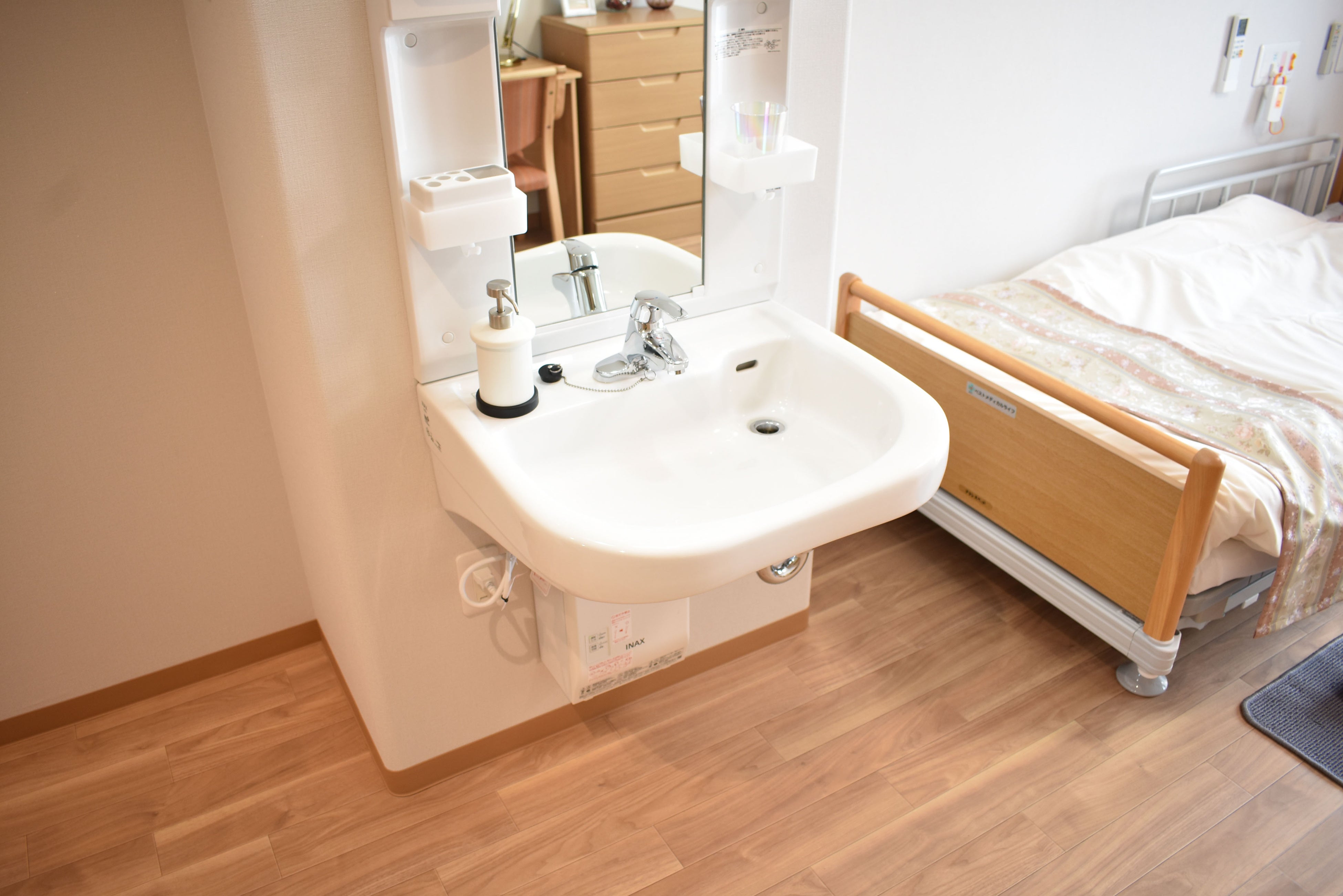 全てのお部屋が、お一人おひとりのプライバシーに配慮した個室(ワンルームタイプ・19.31㎡)で、緊急コールやスプリンクラーといった高齢者の安全をお守りする設備はもちろん、介護専用電動ベッドや手元で温水を操作できる車いす対応の洗面台をはじめとする、快適な生活を実現するためのさまざまな設備を整えています。