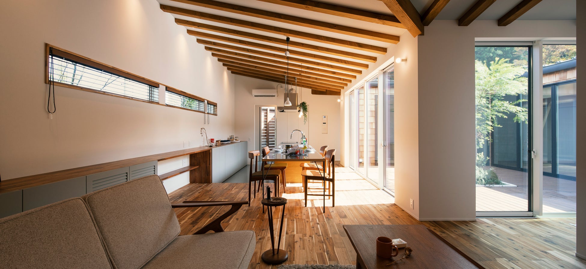 オリジナルの造作ソファがあるダウンフロアリビングは、床・壁をタイルで仕上げ、中庭まで連続させる事でウチとソトを一体化。