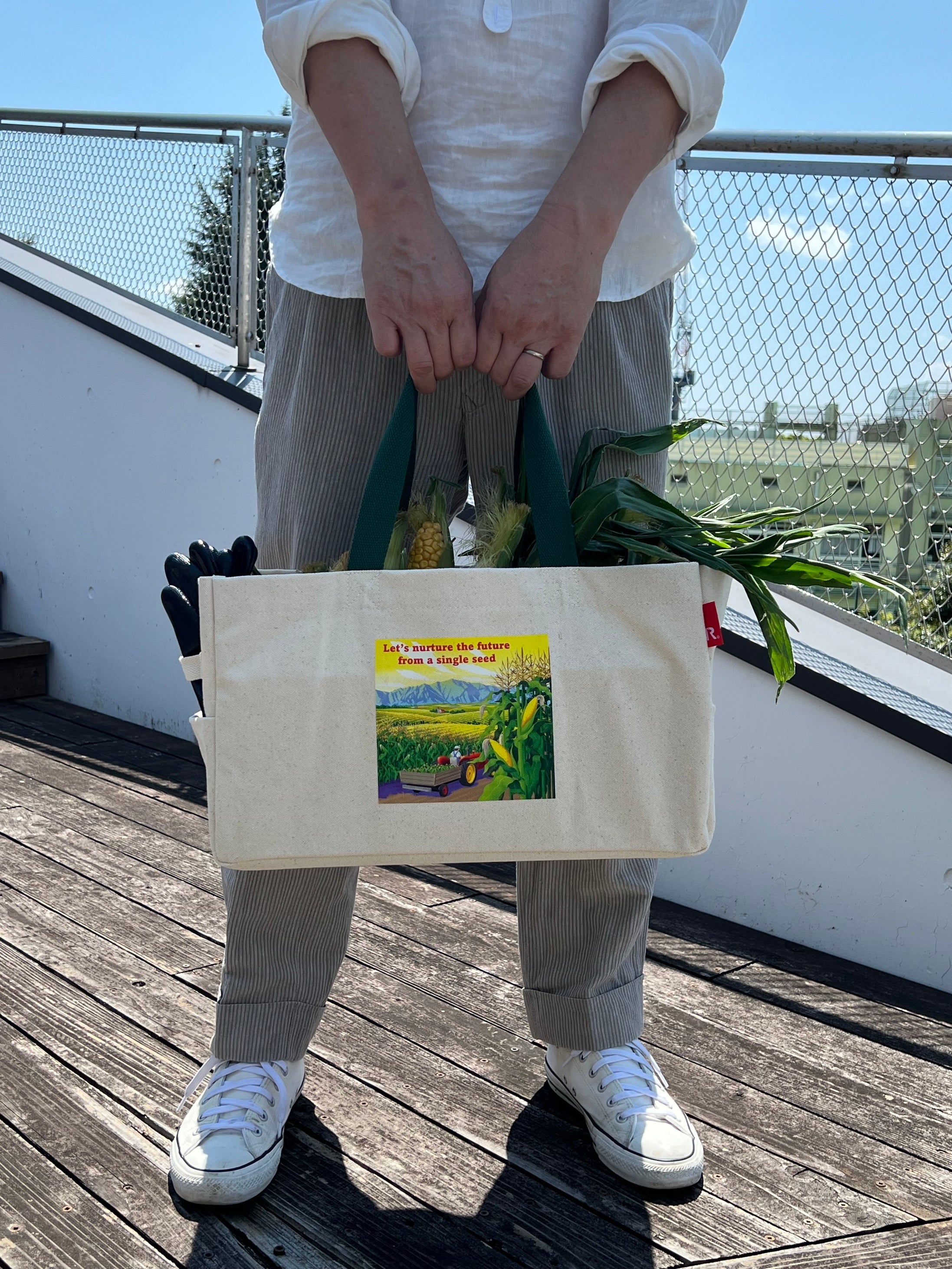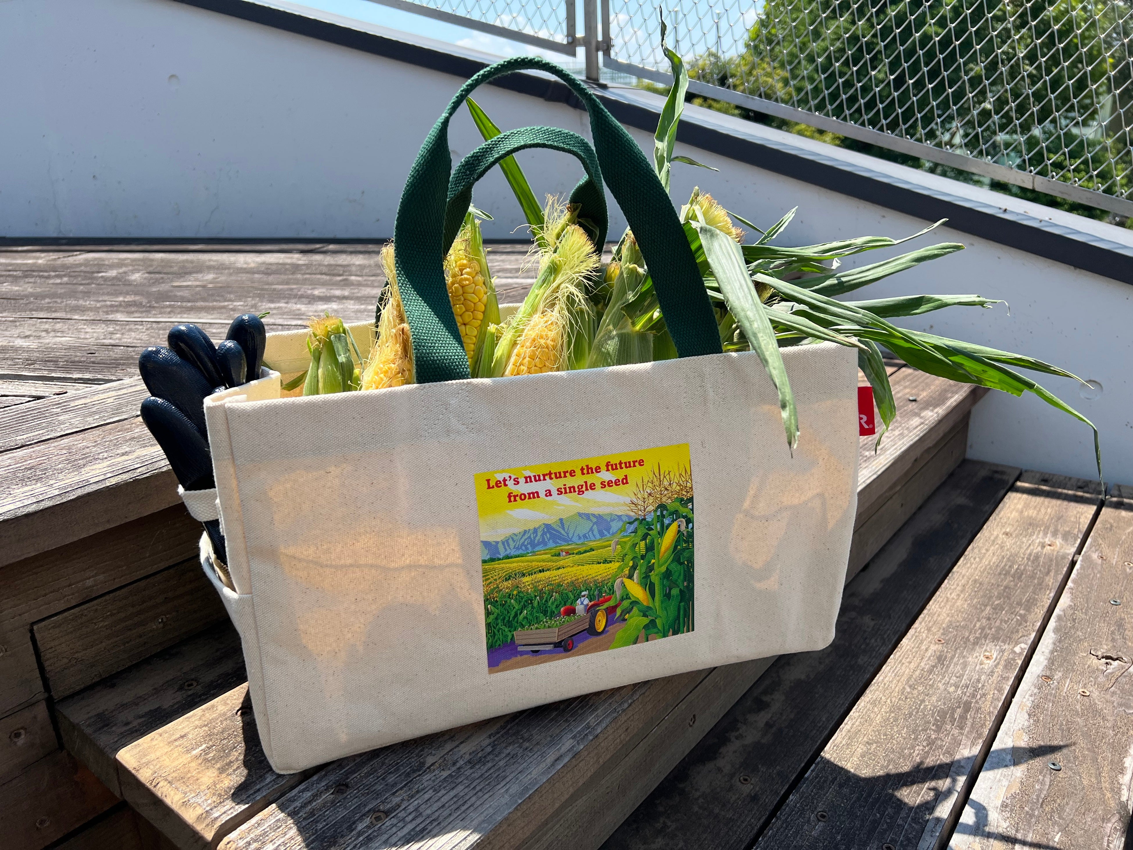 コーンサイズの仕切り付きで、繊細なコーンひとつひとつをやさしく収めて持ち運ぶことができる11本タイプ。サイドのルーポケットは、コーンの収穫に欠かせない手袋の収納に便利です。”Let’s nurture the future from a single seed.”(一粒の種から未来を育てよう。) のメッセージをプリントしています。